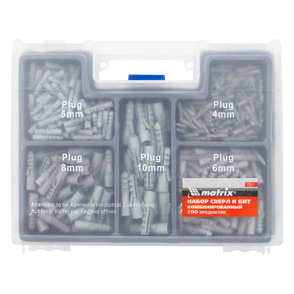 Комбинированный набор Matrix 72577 — универсальное решение для мастеров, т.к. он содержит 300 предметов: дюбели, отверточные биты, сверла по дереву 4-10 мм, сверла по бетону 4-10 мм и сверла по металлу 2-10 мм. Оснастка рассчитана на бытовое использование.