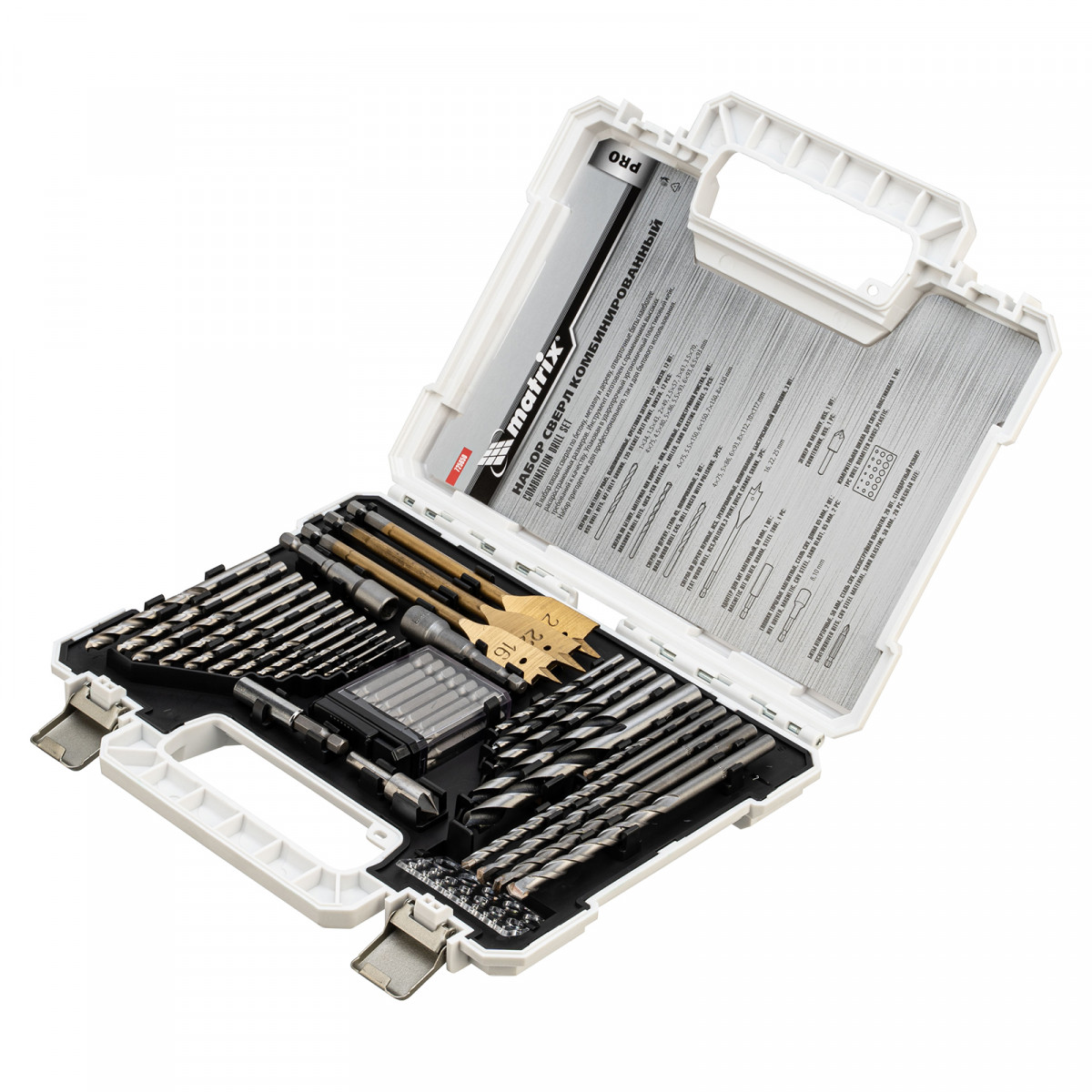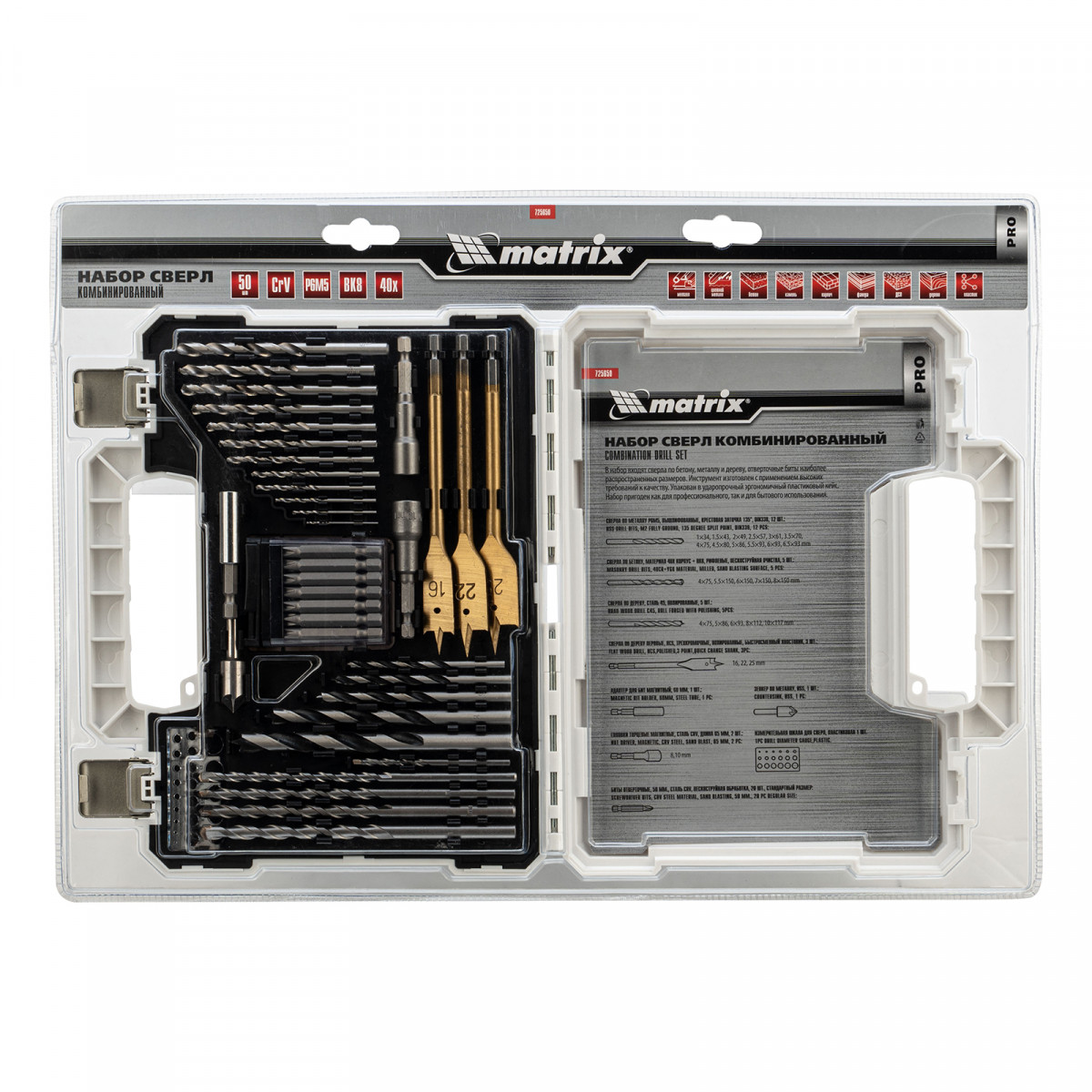 Комбинированный набор Matrix 725650 — универсальное решение для мастеров, т. к. он содержит 50 предметов: отверточные биты (20 шт.) и адаптер к ним, зенковку, 2 торцевые головки, калибровочную шкалу, сверла по дереву 4-10 мм, сверла перовые 16-25 мм, сверла по бетону 4-8 мм и сверла по металлу 1-6,5 мм. Оснастка подходит как для бытового использования, так и решения профессиональных задач.