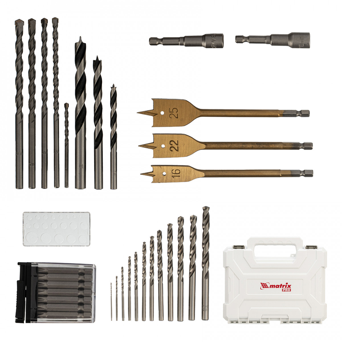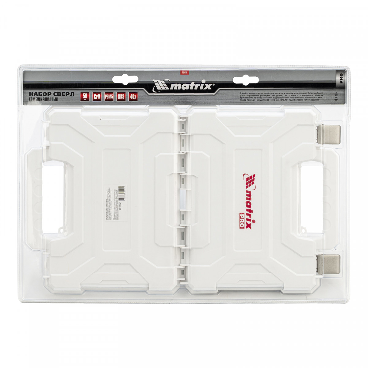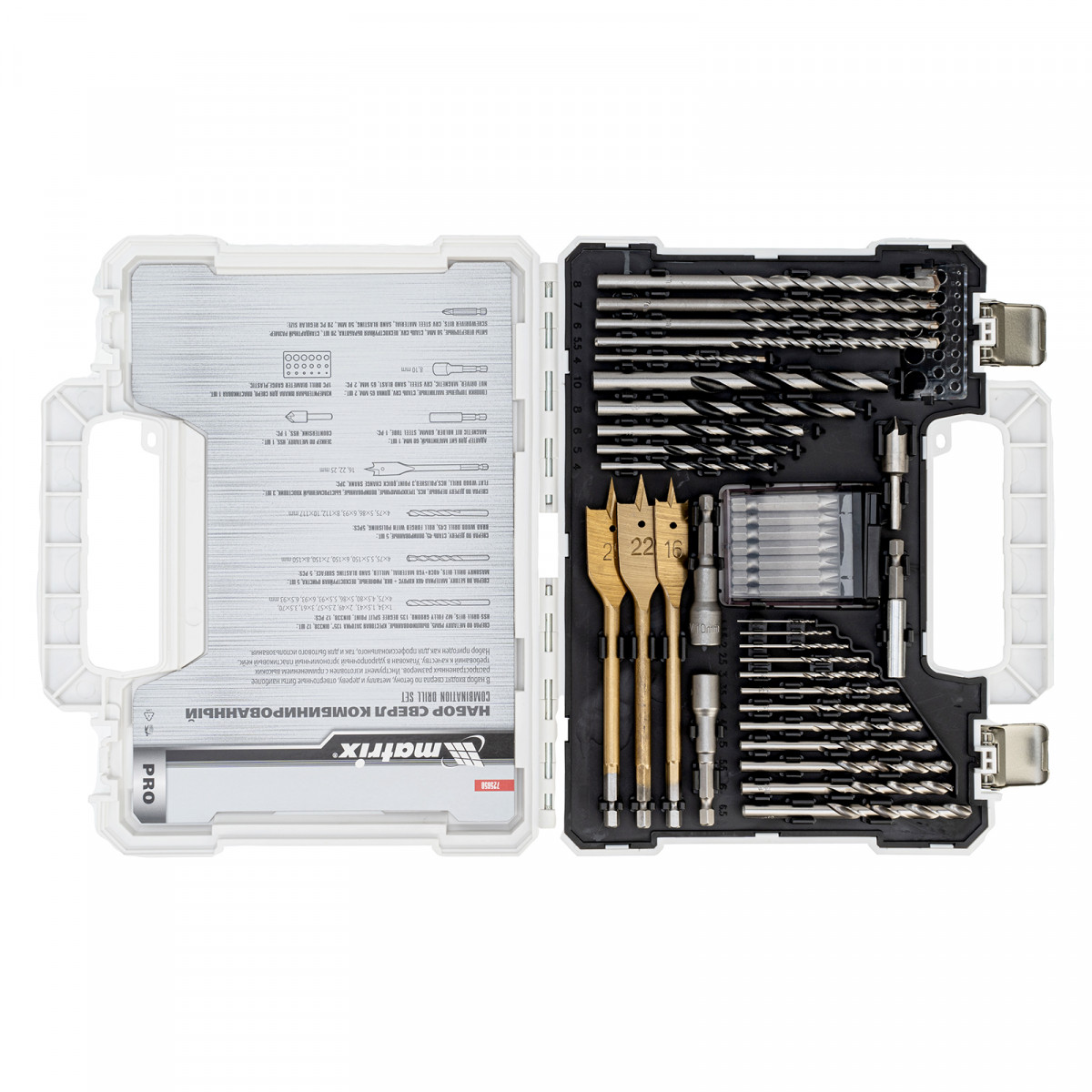 Набор сверл комбинированный, сверла по металлу 1-6.5 мм, бетону 4-8 мм, дереву 4-10 мм, перовые 16,22,25 мм, биты 20 шт, адаптер, головки 2 шт, зенковка, 50 предметов Pro Matrix