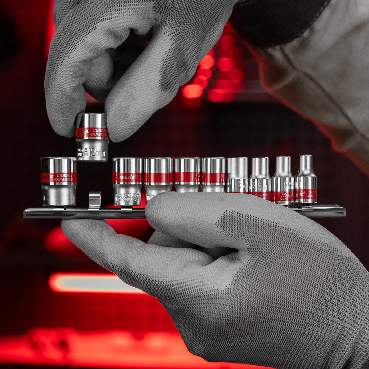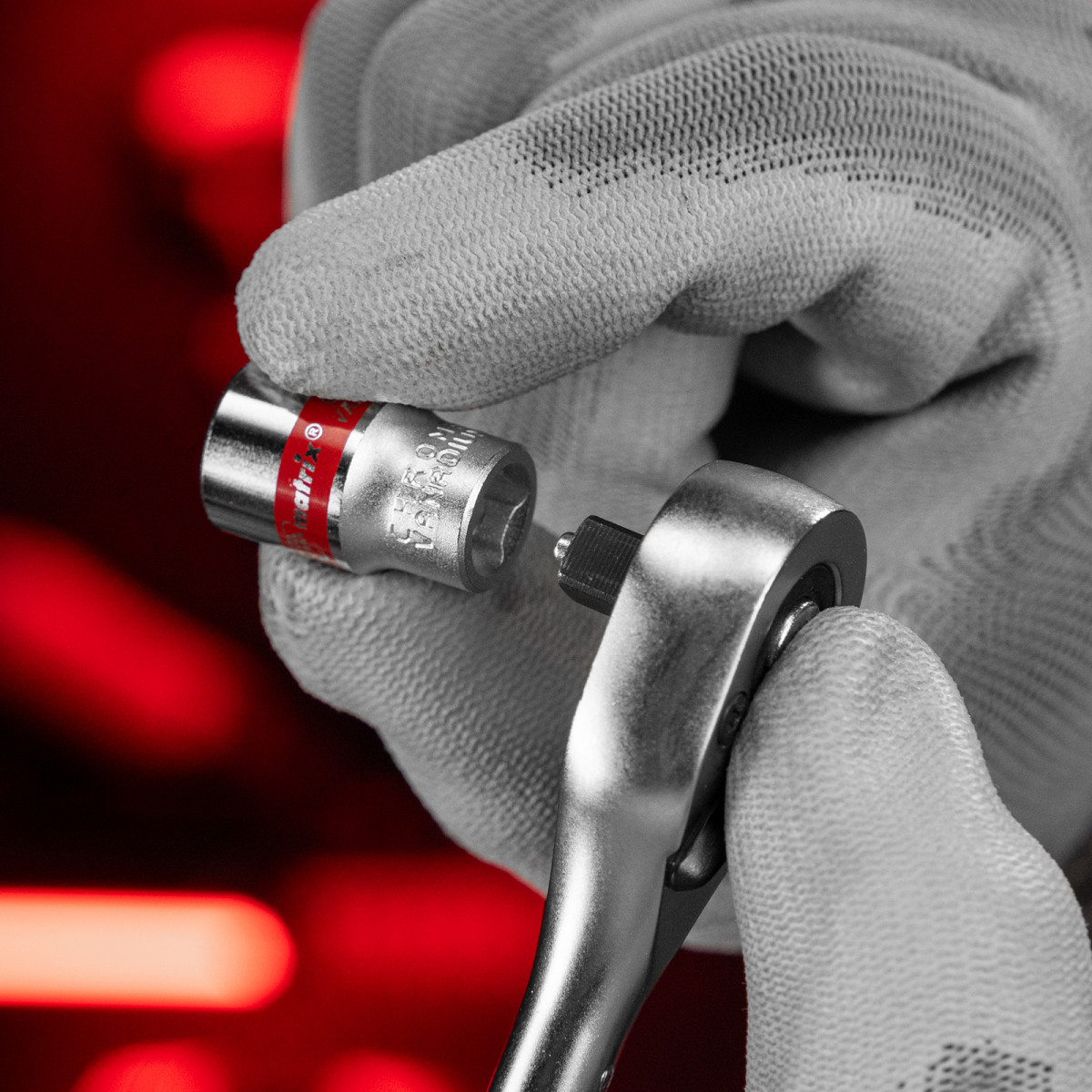 • Быстрый поиск нужной торцевой головки — на корпусах насадок имеются красные полоски и маркировка с обозначением размера.