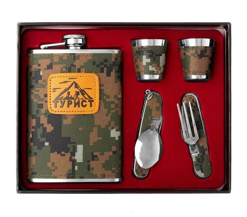 Набор Турист (фляжка 270 мл + 2 стопки+складные вилка и ложка) (HS-TZ-9) Helios Набор Турист прекрасный подарок на памятную дату. Фляжка и стопки изготовлены из нержавеющей стали. КОМПЛЕКТАЦИЯ • 1 фляжка 270 мл. • 2 стопки. • складная ложка. • складная вилка.
