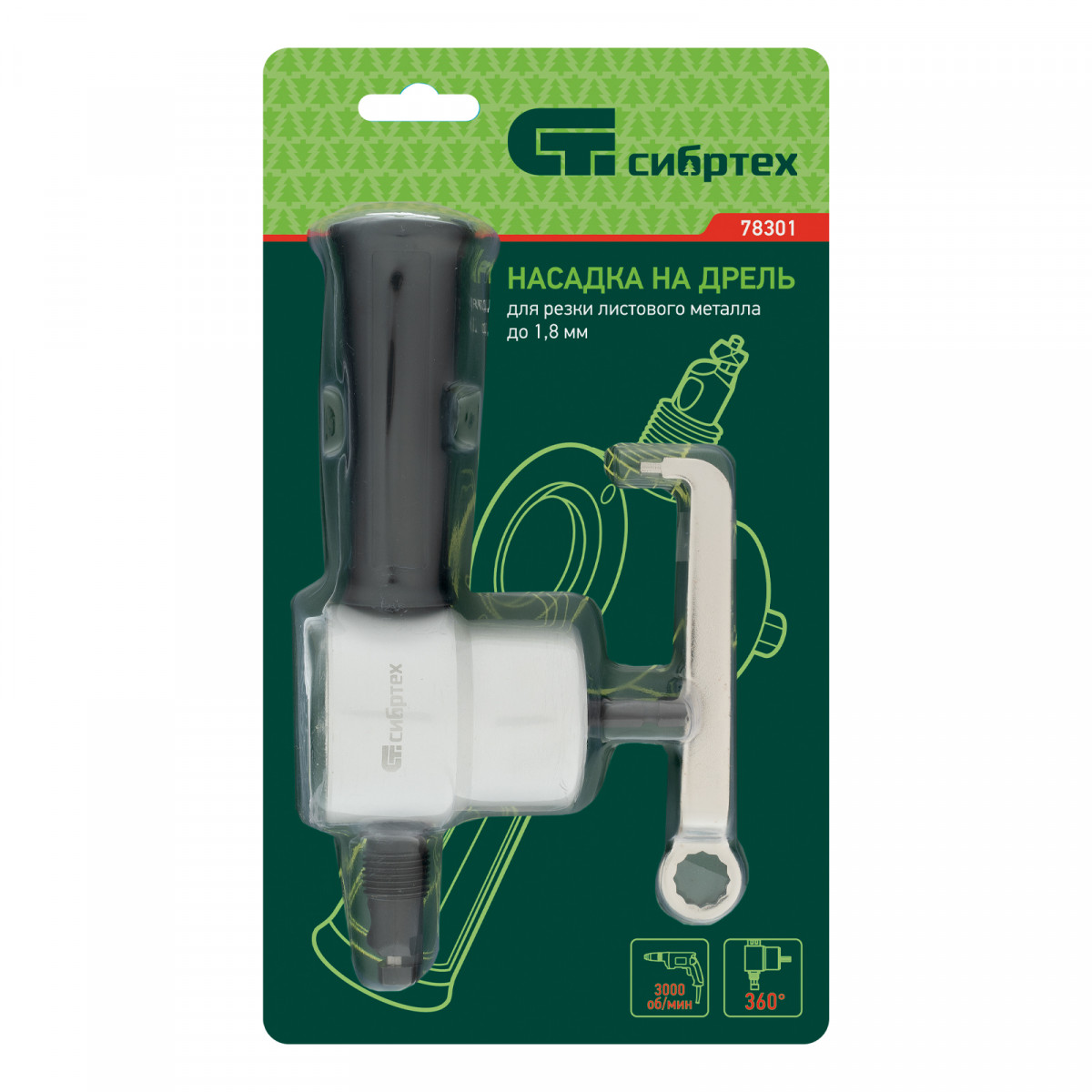 Насадка на дрель для резки листового металла Сибртех 78301 позволяет разрезать сталь толщиной до 1,8 мм, нержавеющую сталь толщиной до 1,2 мм, медь и алюминий — до 2 мм. Ширина реза составляет 6 мм, он может быть не только прямым, но и фигурным. Приспособление устанавливается на электрические дрели со скоростью вращения 3000 об/мин. Насадка для резки металла будет полезна при проведении кровельных работ, а также пригодится в слесарной мастерской, на даче или в гараже.