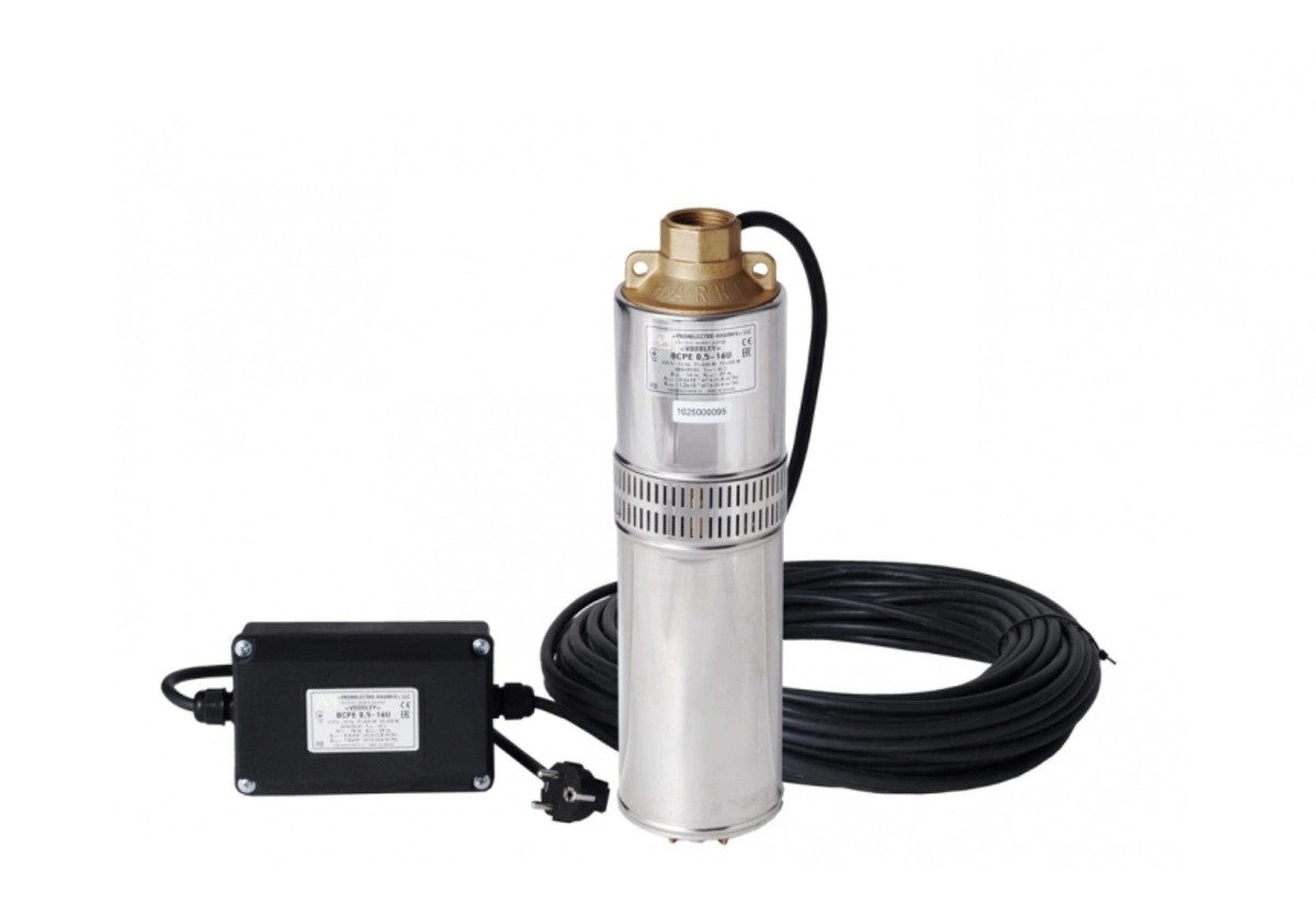 Бытовой Центробежный Погружной Электронасос для колодцев и скважин диаметром от 110 мм, с номинальным напором 25 метров, предназначен для перекачивания чистой воды в бытовых условиях. Номинальный расход: 1,8 м³/чНоминальный напор: 25 м. Потребляемая мощность: 500 ВтПроизводство: «Промэлектро», г.Харьков, Украина Насос Водолей БЦПЭ может быть использован для подачи воды из любого источника (колодец, скважина, емкость, река). Он очень компактный и легкий, поэтому без особого труда может использоваться в переносном варианте. При использовании в ручном режиме насос достаточно просто включить в розетку.Асинхронный, маслозаполненный электродвигатель через промежуточную муфту приводит в движение вал насосной части, на котором жестко закреплены рабочие колеса, перекачивающие воду. Принцип действия насоса — центробежный. Забор воды происходит между двигателем и насосной частью, через отверстия во всасывающей решетке.Насос снабжен электрокабелем и конденсаторным блоком. Кабель выведен из двигателя и проходит вдоль насосной части сбоку, под защитной планкой. Верхняя крышка насоса с резьбовым патрубком (без встроенного обратного клапана), и двумя проушинами для крепления страховочного троса.В обмотке двигателя встроено надежное тепловое реле, которое защищает насос по току (перегрузке). Автоматический перезапуск при срабатывании реле. Защиты от сухого хода в насосе нет, установка внешней защиты по необходимости.