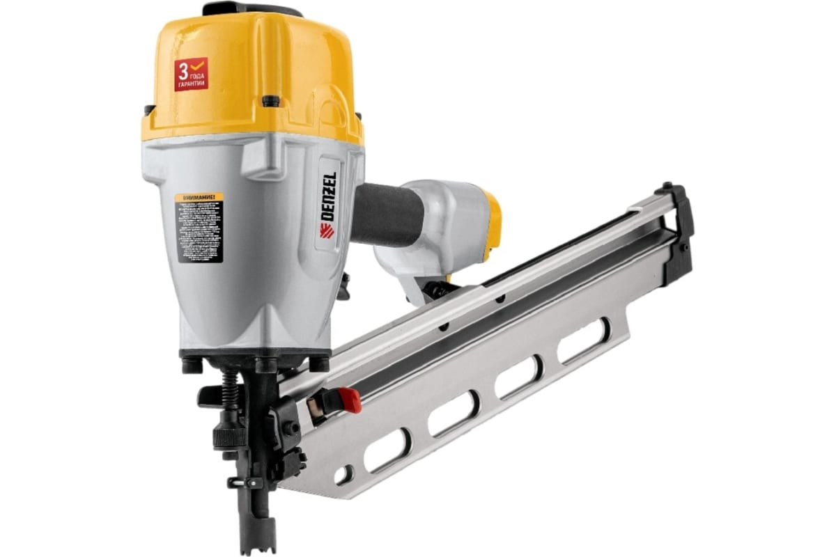 Пневматический нейлер Denzel PN2190 57429 предназначен для сборки каркасов деревянных домов, для устройства террас и настил , а также выполнения других работ по креплению листовых материалов с помощью гвоздей SN21 длиной от 50 до 90 мм. Рабочее давление составляет 7.5 атмосфер, что обеспечивает эффективность и высокую скорость забивания крепежа. Инструмент также пригодится для сборки мебели, строительных и отделочных работ.