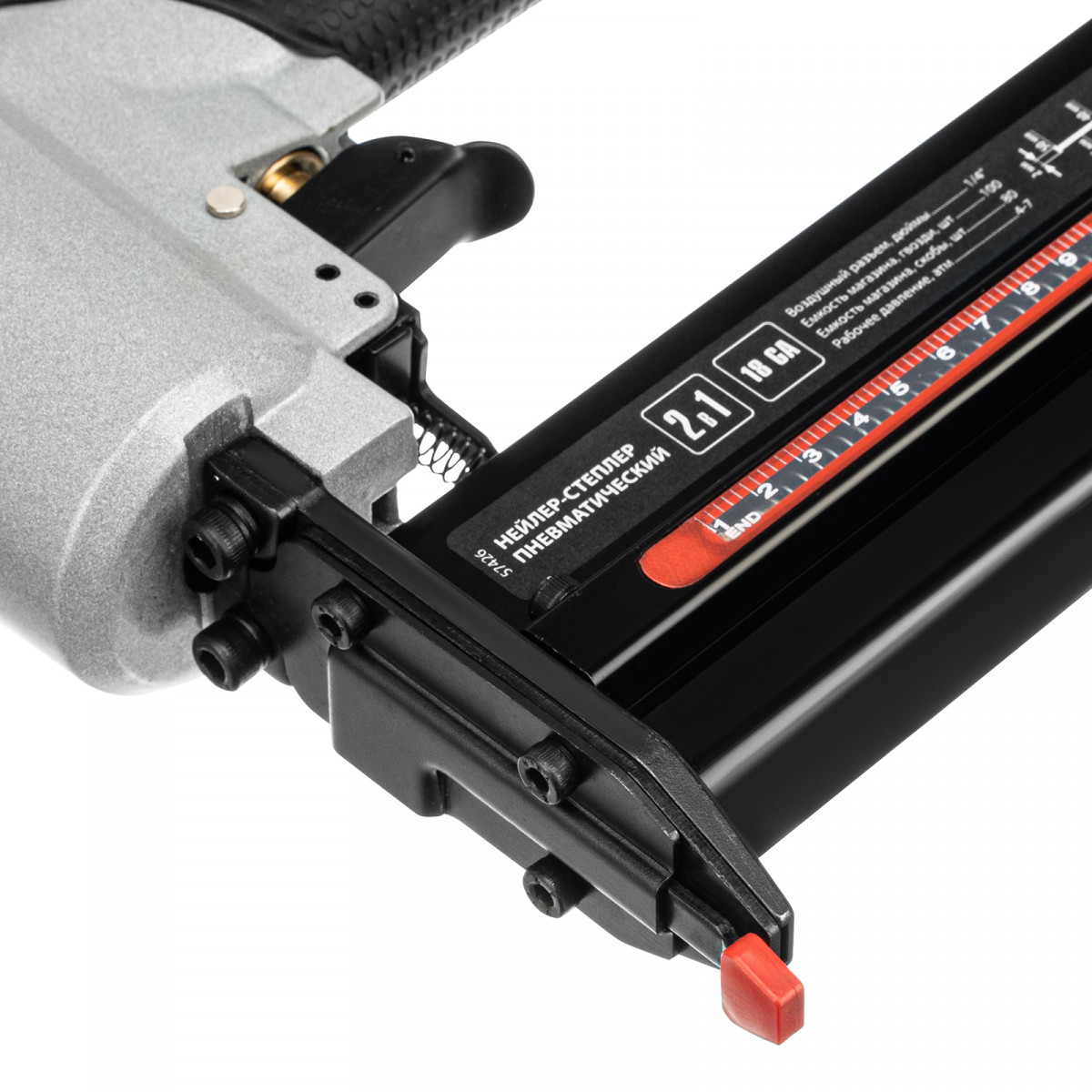 Пневматический нейлер-степлер 2 в 1 Matrix 57426 работает с двумя типами крепежей 18GA: гвоздями длиной 10-50 мм и скобами длиной 25-40 мм. Пригодится при сборке мебели и деревянных каркасов, для обшивки и утепления дома, при установке окон, дверей, плинтусов, напольных покрытий и для производства упаковки. Низкий расход воздуха 0,7 л/мин позволяет использовать инструмент с любыми типами компрессоров.