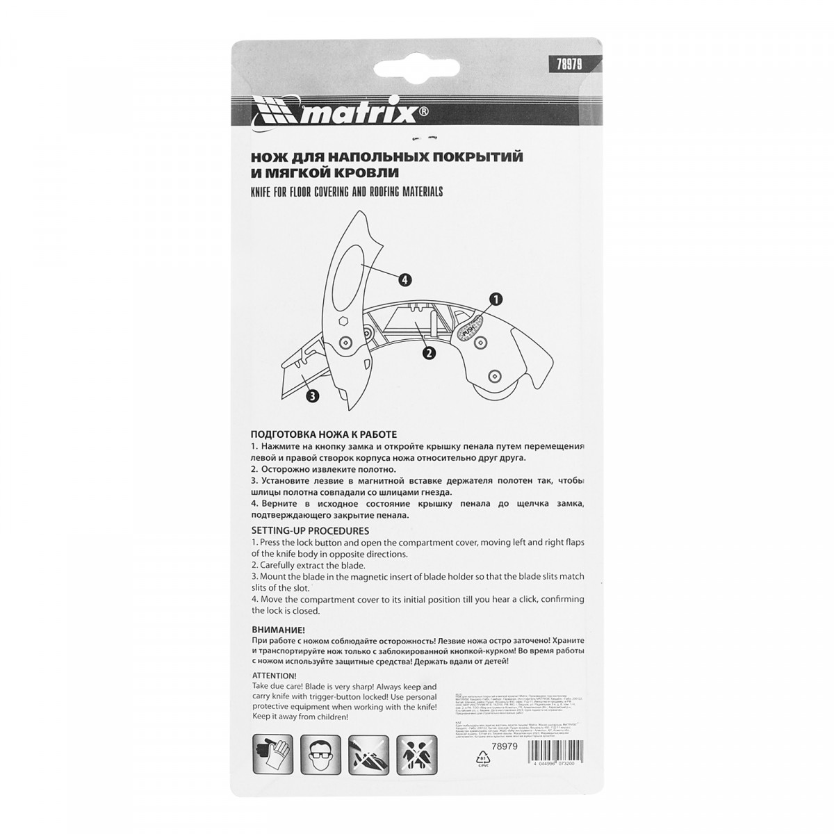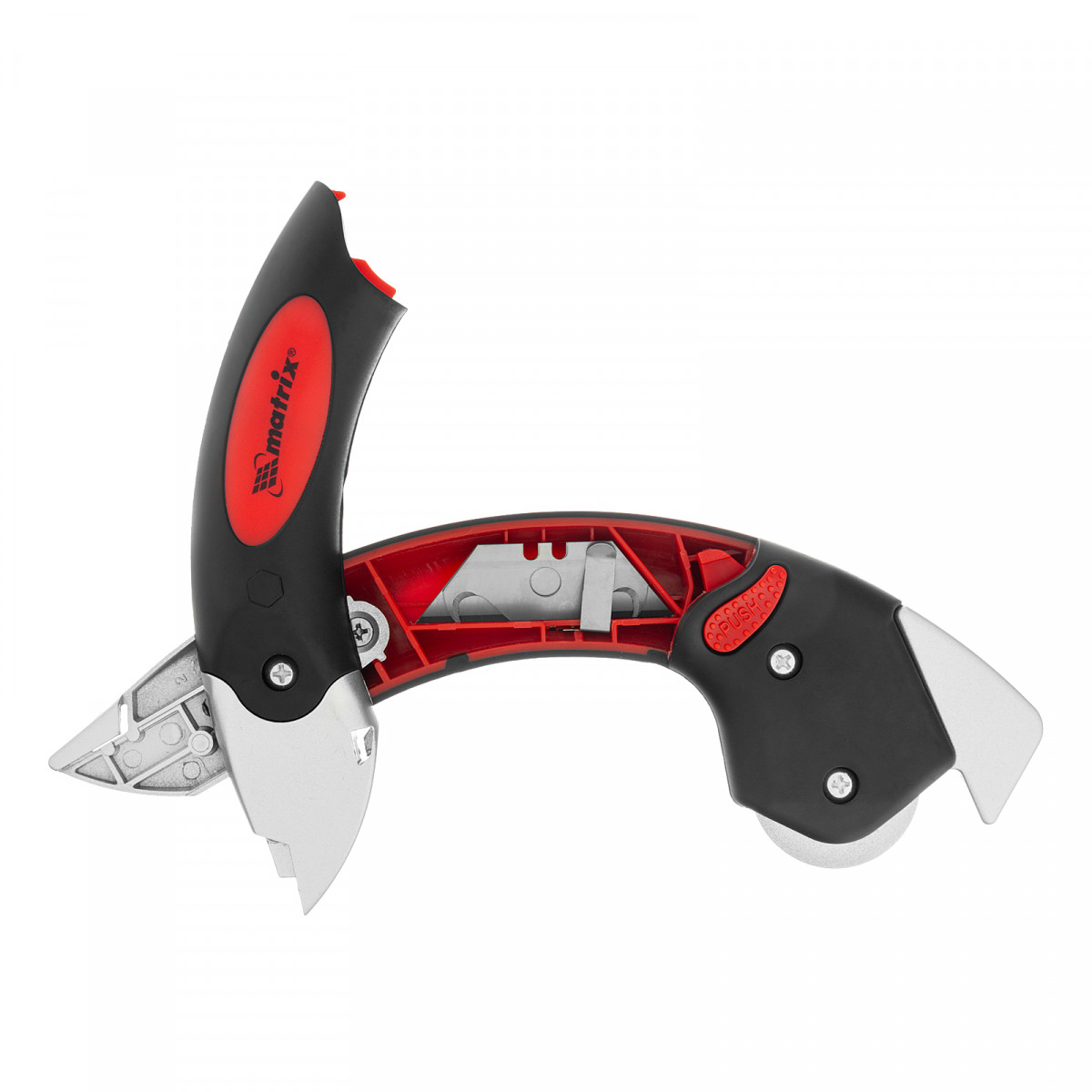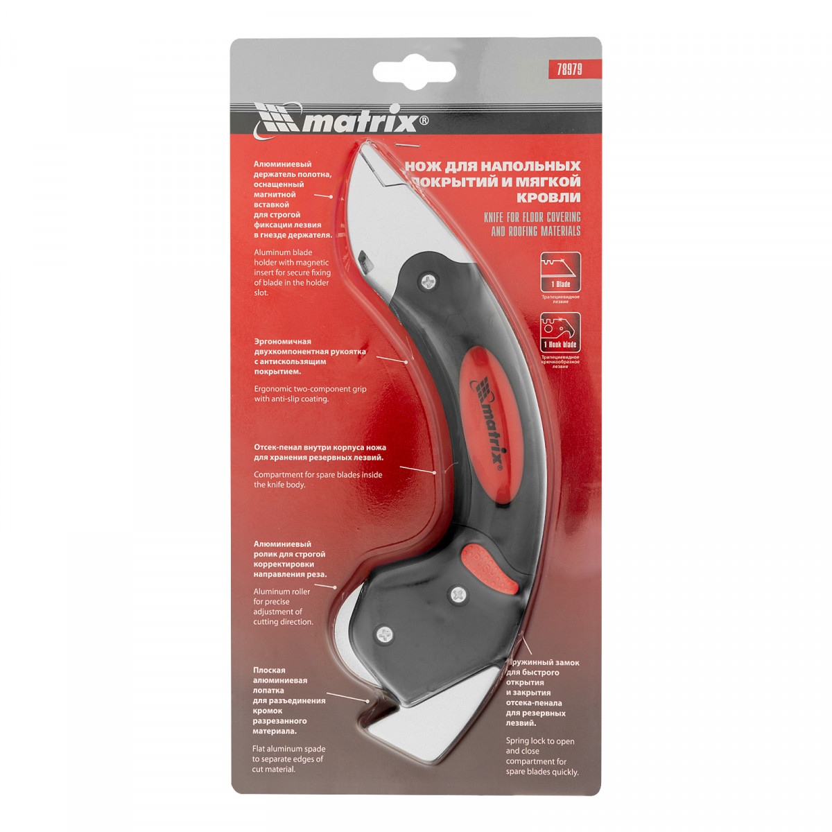 Нож Matrix 78979 предназначен для резки напольных покрытий, таких как линолеум или ковролин, а также мягкой кровли. Алюминиевый направляющий ролик в хвостовой части инструмента позволяет работать быстро и без потери точности. Лезвие не отклоняется от линии реза, т.к. надежно удерживается алюминиевым держателем с магнитной вставкой. Нож пригодится во время проведения ремонтных или кровельных работ, также будет полезен в быту.