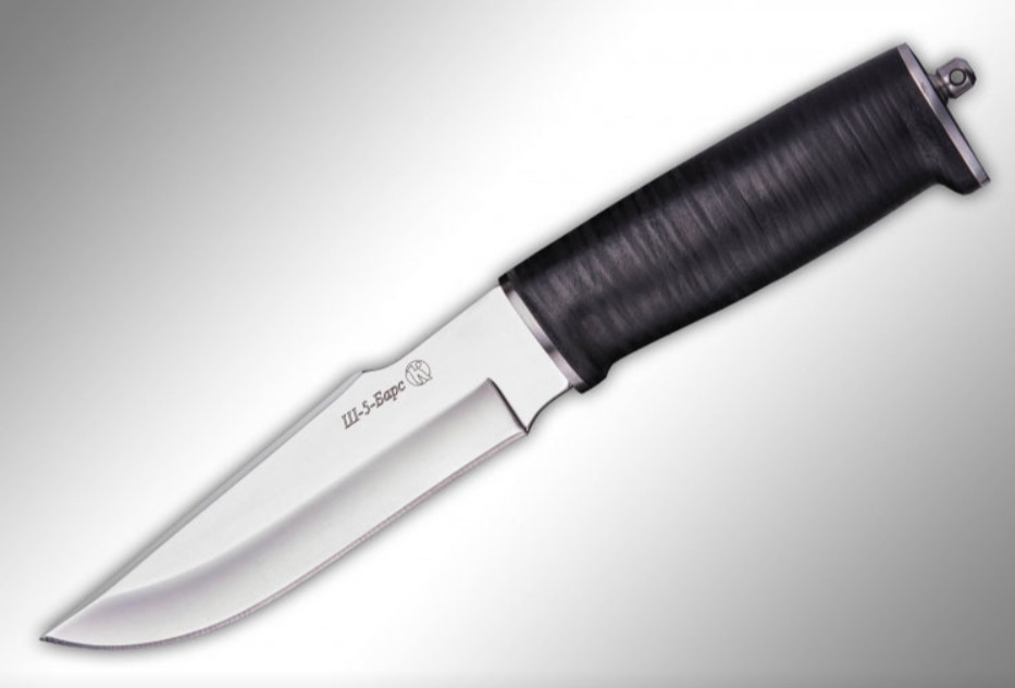 Нож изготовлен по образцу давно всем полюбившегося ножа "Ш-5" . В отличии от оригинала, Ш-5 «Барс» не является холодным оружием за счет немного укороченной гарды. Нож придется по вкусу любителям традиционных материалов – выпускаются модификации с рукоятью изготовленной из кожи или из наборной кожи-дерева. Ножны, традиционно делаются из натуральной кожи с тиснением рисунка. Клинок изготовлен из стали AUS-8, которая используется на всех серийных ножах нашего производства, зарекомендовала себя с хорошей стороны благодаря хорошей износостойкости, легкой правке режущей кромки, а также стойкости к коррозии.