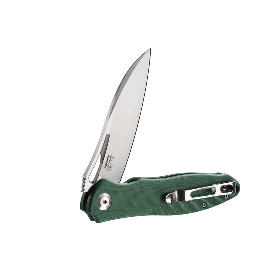 Ручка ножа изготовлена из материала G10, за счет этого она износостойкая, защищенная от воздействия высокой температуры, влаги, и устойчивая к повреждениям. Также этот материал, который представляет собой стеклотекстолит, запросто окрашивается. Он шероховатый на ощупь. Изделие удобно ложится в руку, не смещается, не скользит. Нож относят к категории так называемых флипперов.
