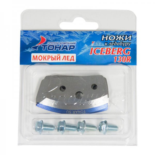 Ножи к ледобуру ICEBERG 130R имеют радиальную форму, диаметр бурения - 130 мм. Радиусная форма ножей является универсальной. На ножах "Мокрый лед" сделан специальный угол заточки ножа для сверления сырого льда. В комплекте с ножами идут 4 крепёжных болта. Материал: высокоуглеродистая легированная сталь. Высокая твердость – 55-60 HRC.