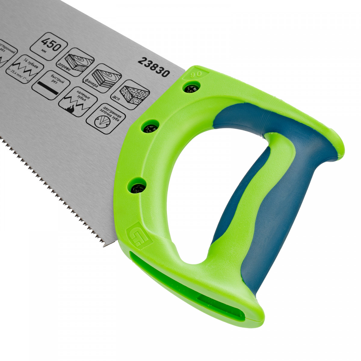 Ножовка по дереву Сибртех «Зубец» 23830 с полотном длиной 450 мм, калеными зубьями с 2D-заточкой и шагом 14 TPI, двухкомпонентной рукояткой, предназначена для точных пильных работ по древесине, фанере и ДСП. Подходит для двустороннего реза. Режущая часть с мелкими зубьями в количестве 14 на дюйм выполняет аккуратный и чистый распил. При необходимости кромку ножовки можно заточить. Инструмент будет полезен в столярной мастерской, а также пригодится в быту.