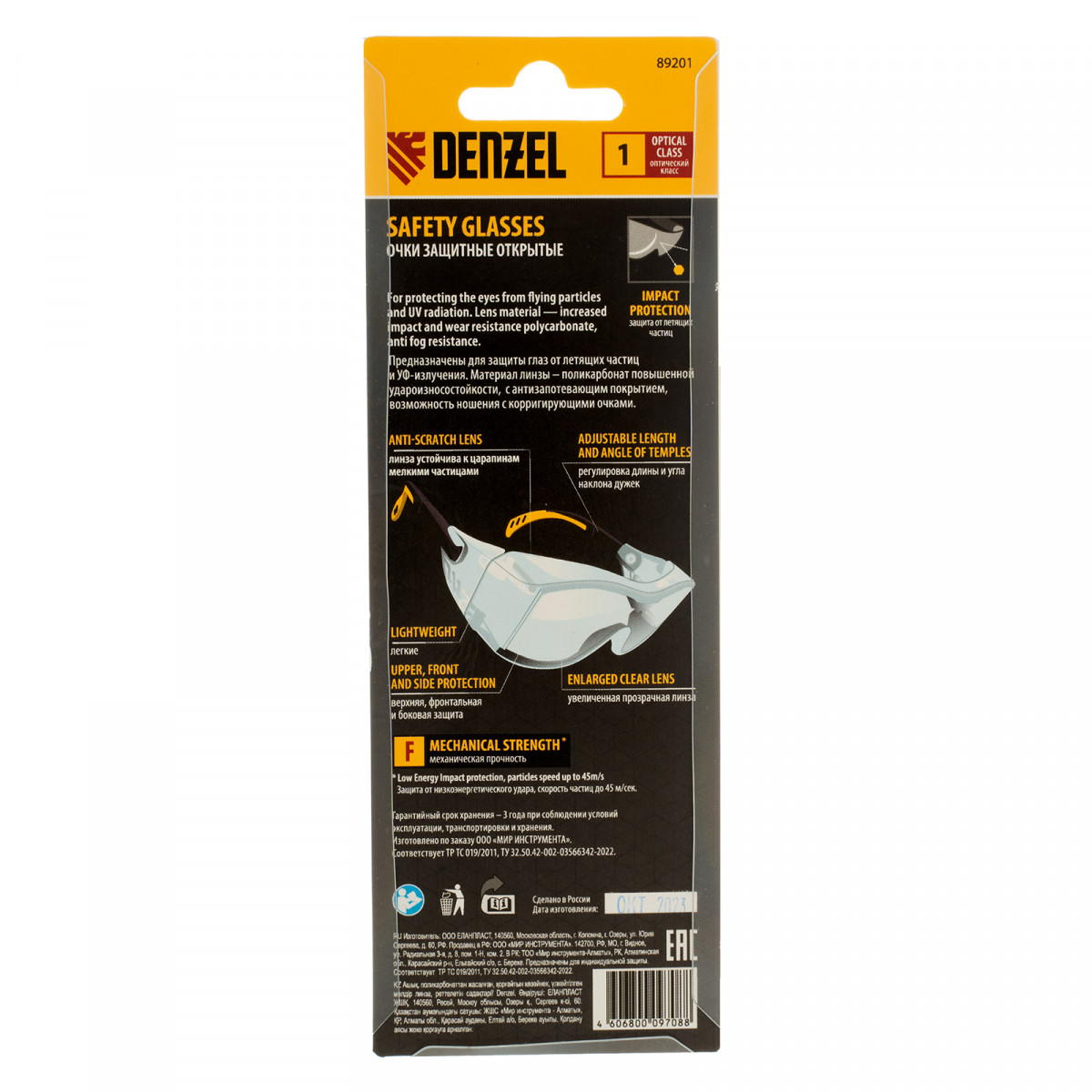 Очки защитные открытые, поликарбонатные, увеличенная прозрачная линза,  регулируемые дужки Denzel