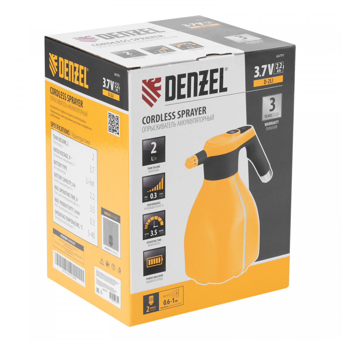 Аккумуляторный опрыскиватель Denzel D-2LI 64791 с баком объемом 2 л и Li-Ion батареей на 3,7 В, емкостью 2,2 А·ч, предназначен для ухода за растениями — внесения жидких удобрений, распыления инсектицидных средств. Также может использоваться для мытья окон, фасадов, дорожек, садового инвентаря. Размер и форма факела регулируются, максимальная дальность распыления составляет 1 м, что позволяет обрабатывать участки различной площади и удаленные места. Опрыскиватель экономит силы и время пользователя, будет полезен в быту и на производстве.