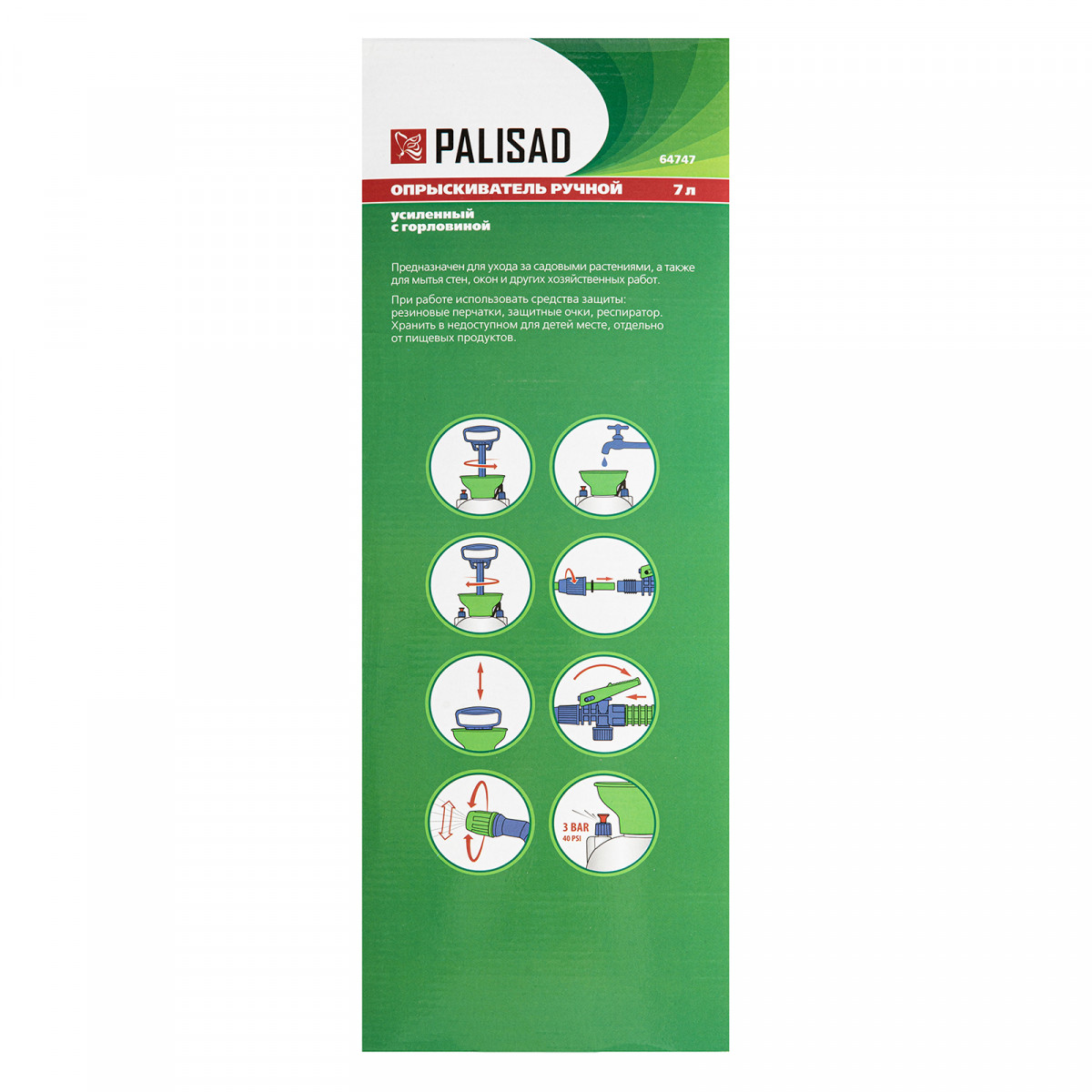 Ручной усиленный опрыскиватель Palisad 64747 вместительностью 7 л, с горловиной, насосом, шлангом и разбрызгивателем, используется для защиты садово-огородных культур от вредителей и болезней, а также для внесения удобрений. Предназначен для работы на дачном участке. Опрыскиватель с широким дном сохраняет устойчивость на горизонтальной поверхности. Также его можно повесить на плечо, освободив руки. Бак обладает повышенной прочностью за счет усиленных стенок и дна. Благодаря широкой горловине можно быстро и аккуратно наполнить емкость раствором.