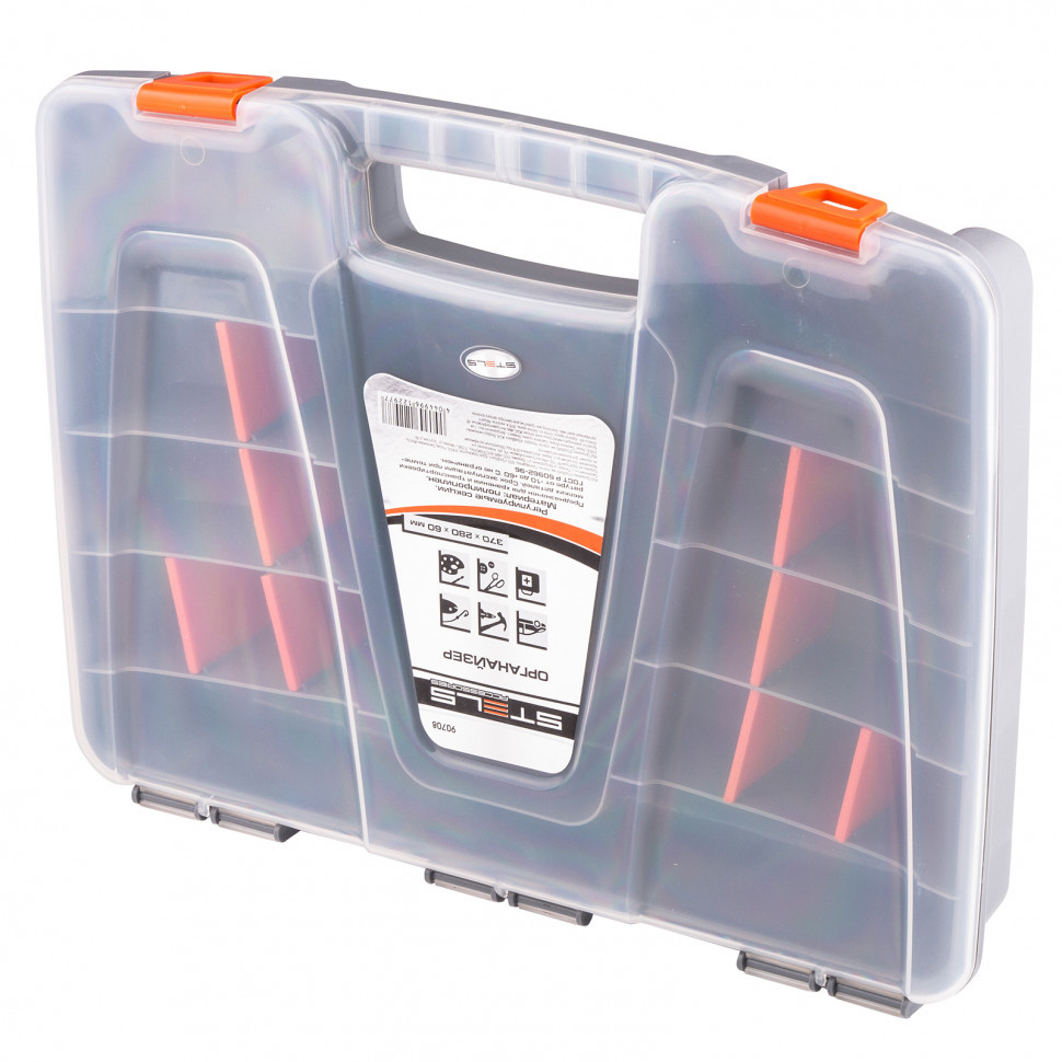 Пластиковый органайзер STELS предназначен для хранения и транспортировки крепежа и различных мелочей. Состоит из нескольких регулируемых по размеру секций и позволяет удобно и компактно разместить все необходимые аксессуары. Изготовлен из полипропилена. Закрывается с помощью двух защелок и имеет ручку для переноски.