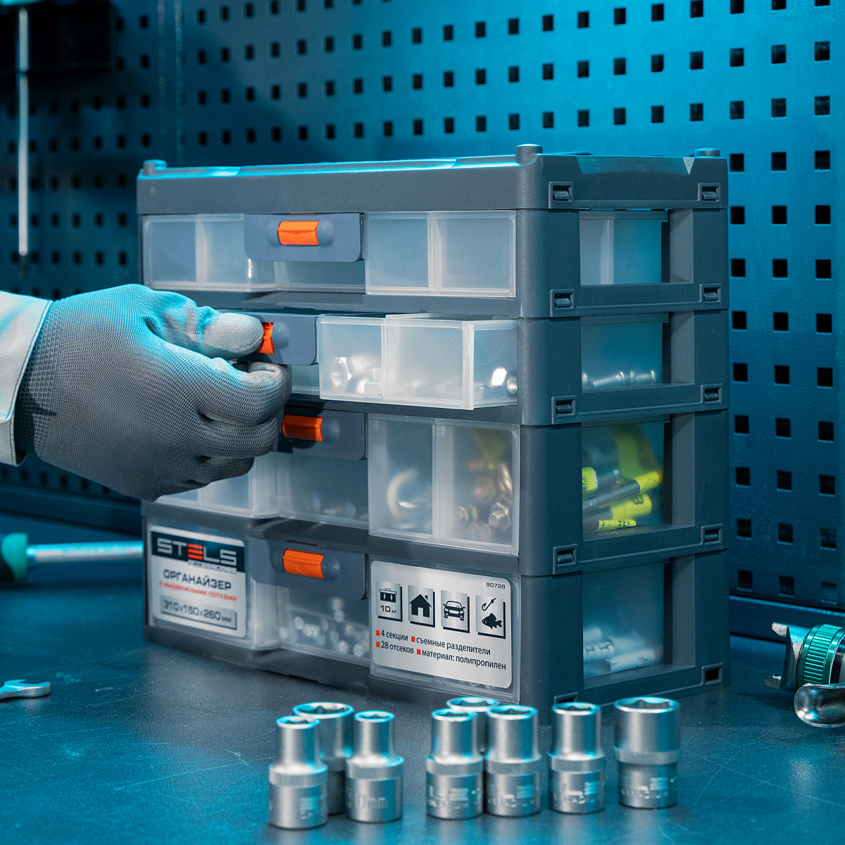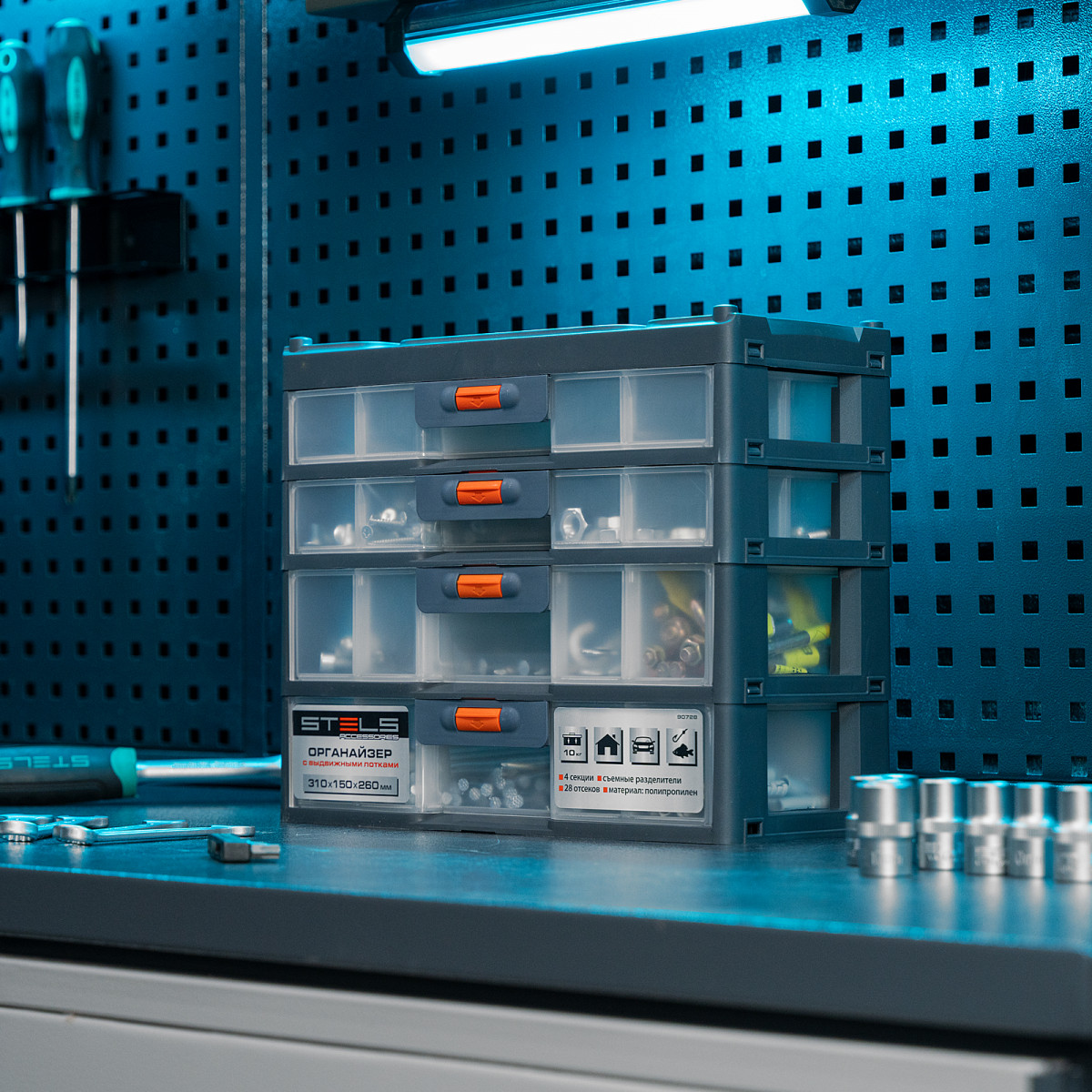 Органайзер Stels 90728 размером 310 х 150 х 260 мм, из пластика, имеет 4 секции с выдвижными лотками и используется для хранения крепежных элементов, принадлежностей для рукоделия, снастей и т.д. Обеспечивает быстрый доступ к предметам, позволяет избежать их перемешивания и утери. Пригодится в гараже, мастерской, будет полезен в домашнем хозяйстве.