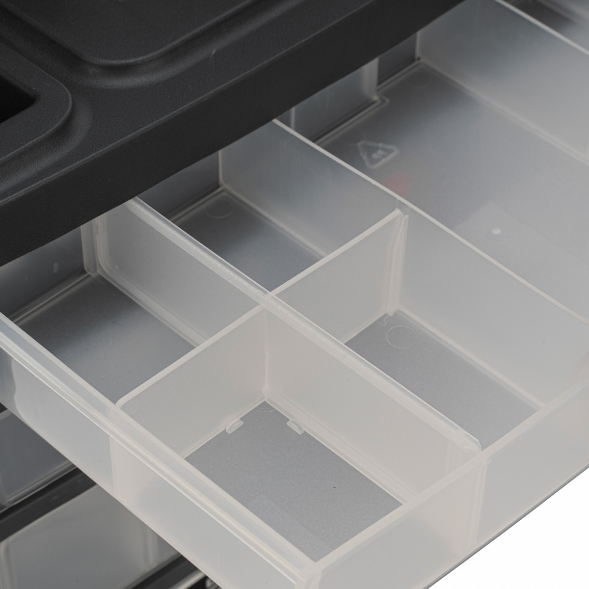 - Продуманная организация внутреннего пространства — в каждый лоток можно установить разделители для сортировки предметов по размеру, это позволит создать до 28 отсеков.
