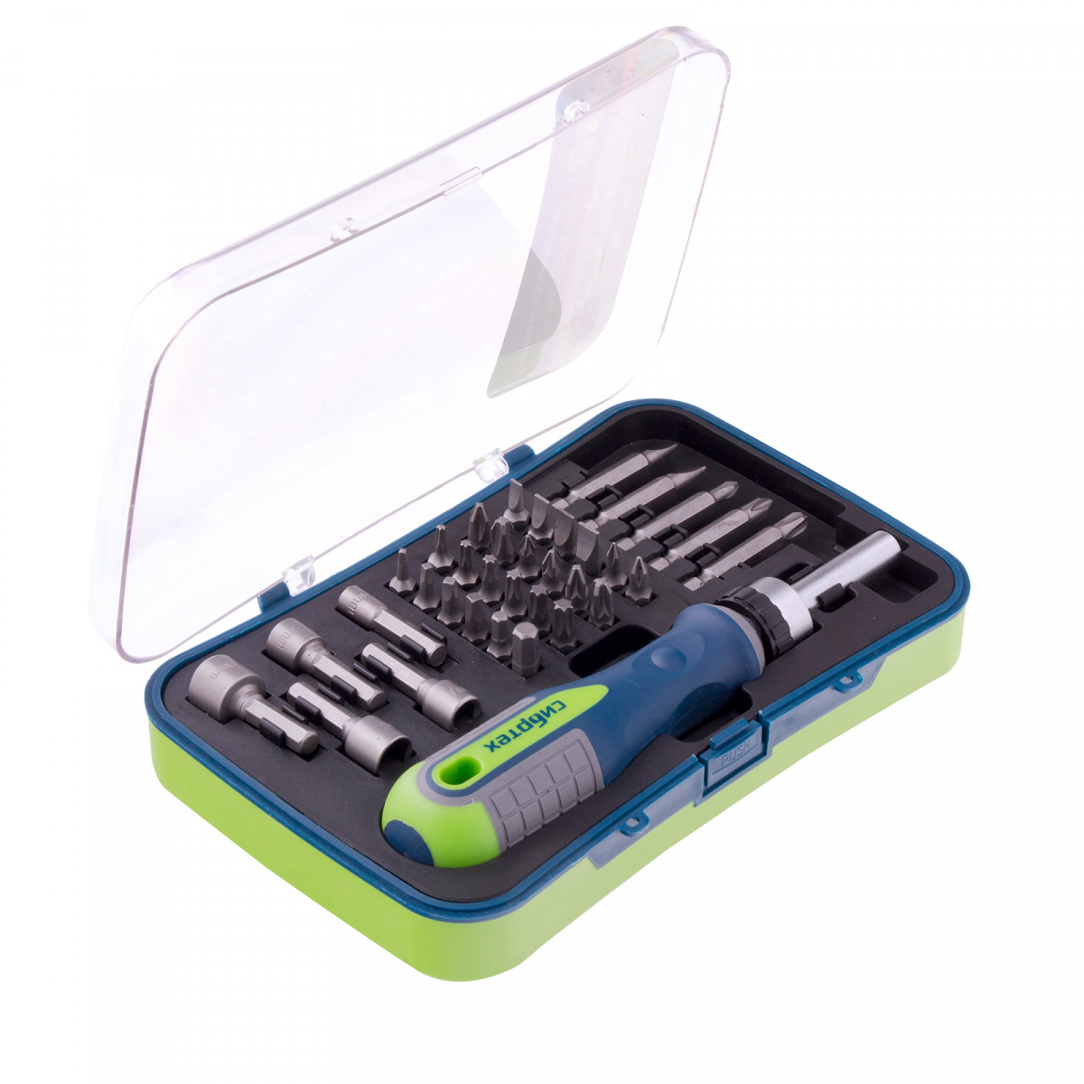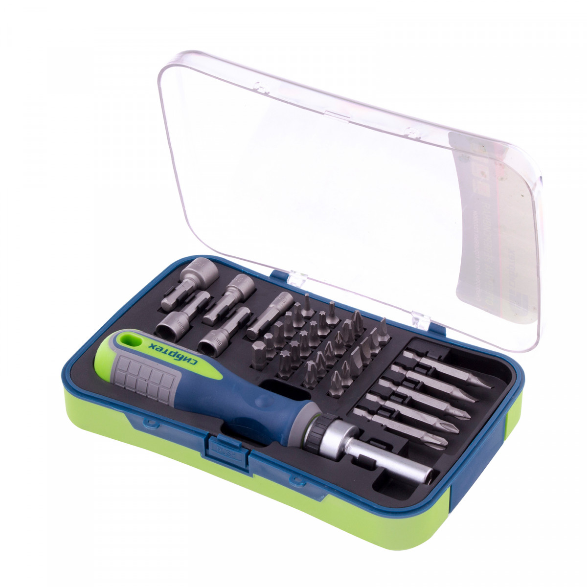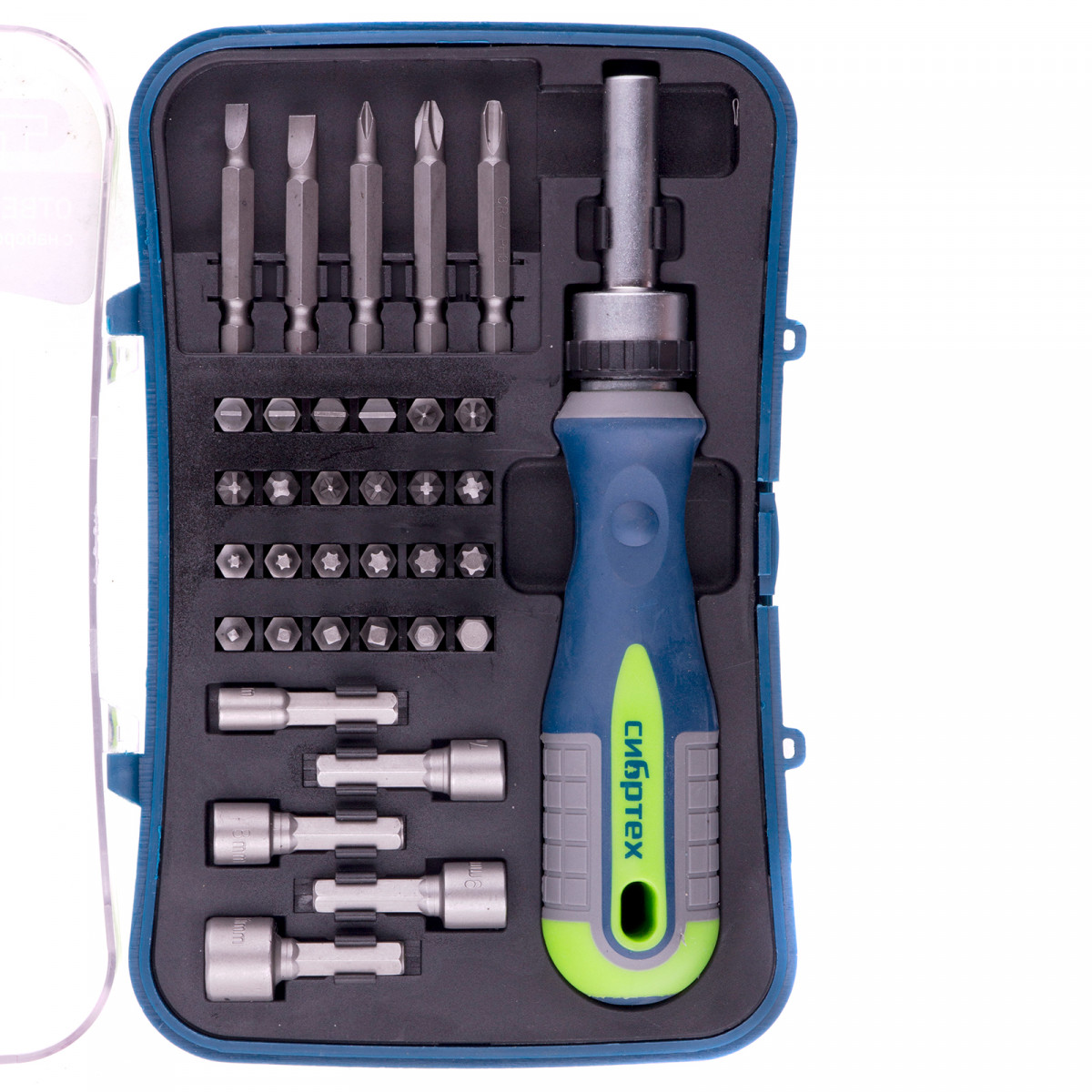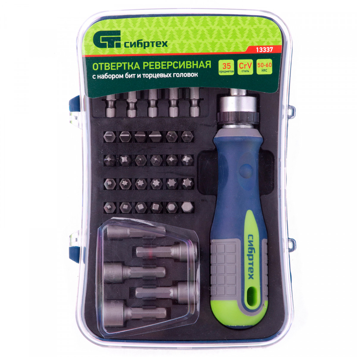 Отвертка реверсивная с набором бит и торцевыми головками, 35 шт, CrV Сибртех