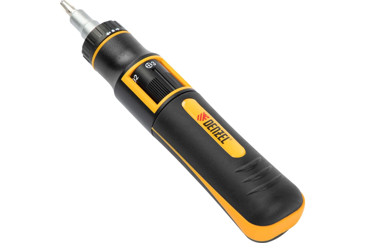 Револьверный механизм отвертки Denzel позволяет с легкостью менять насадки, повышая эффективность работы.