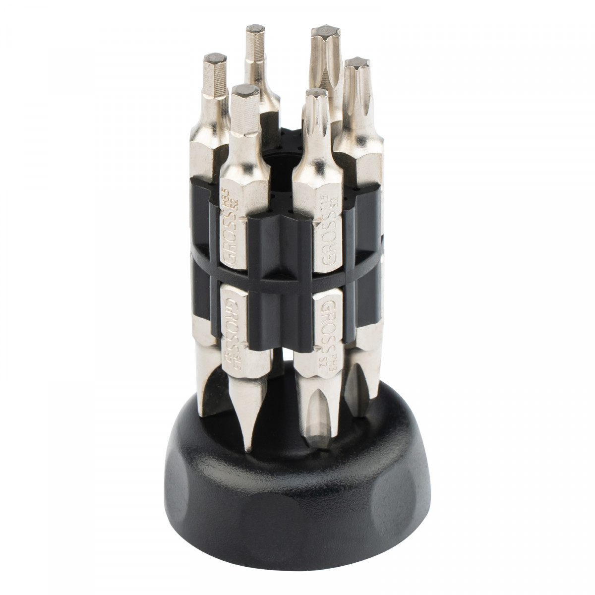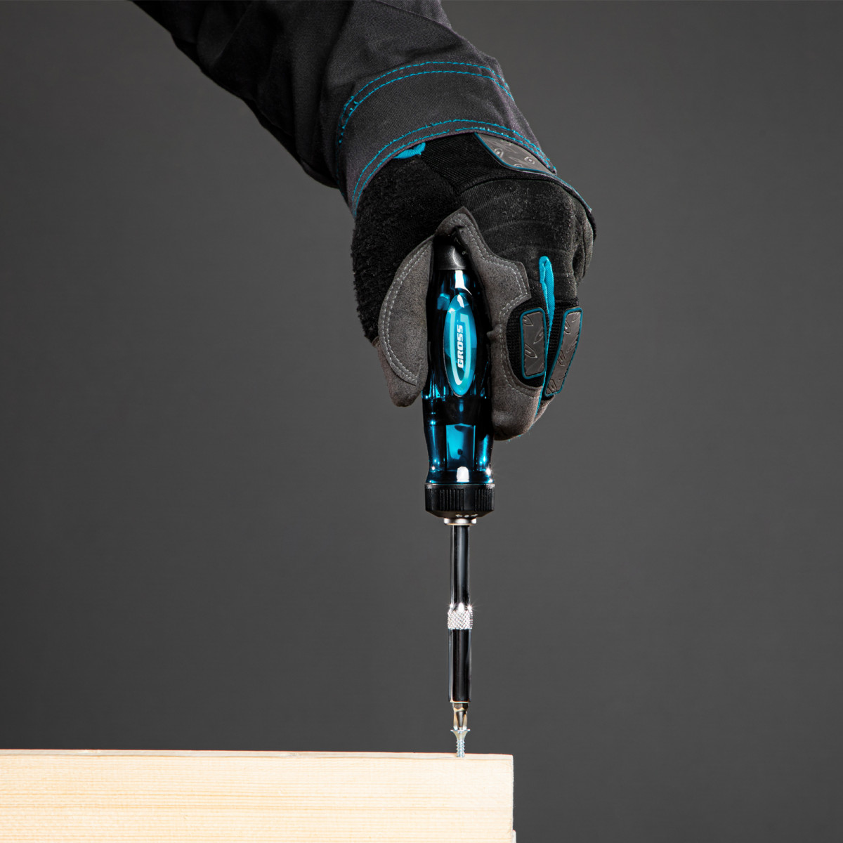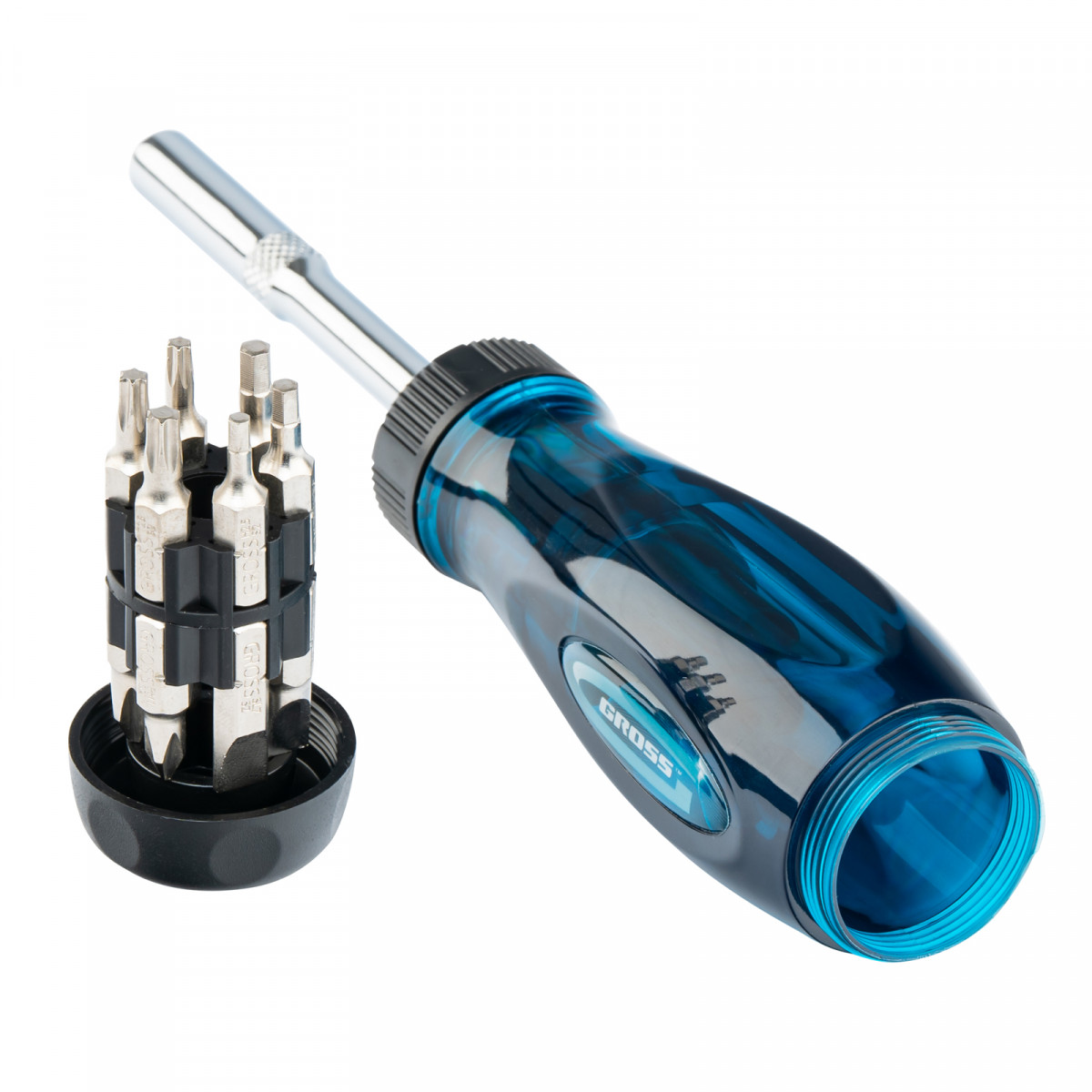 Реверсивная отвертка Gross 11603 с удлинителем и трещоткой на 72 зуба комплектуется 12 сменными битами из стали S2 для эффективной работы с саморезами, винтами и другим крепежом. Она пригодится при проведении монтажных, строительных, ремонтных работ. Для расширения возможностей отвертки можно использовать любые биты длиной 25 мм с хвостовиком 1/4 дюйма.