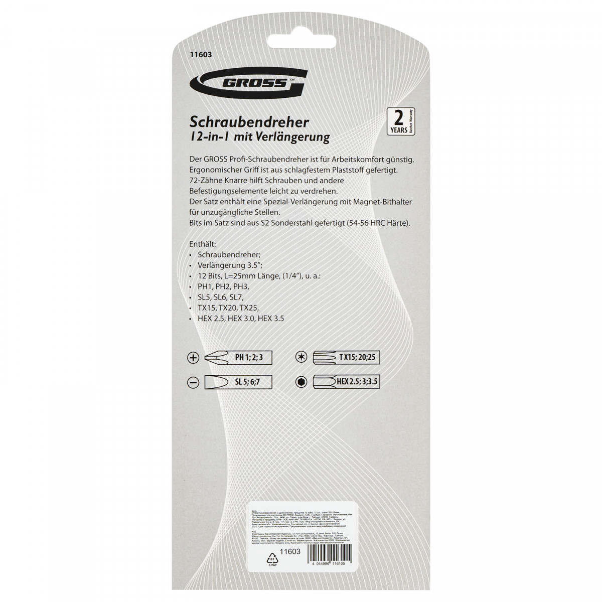 Отвертка реверсивная с удлинителем, трещотка 72 зуба, 12 шт, сталь S2 Gross