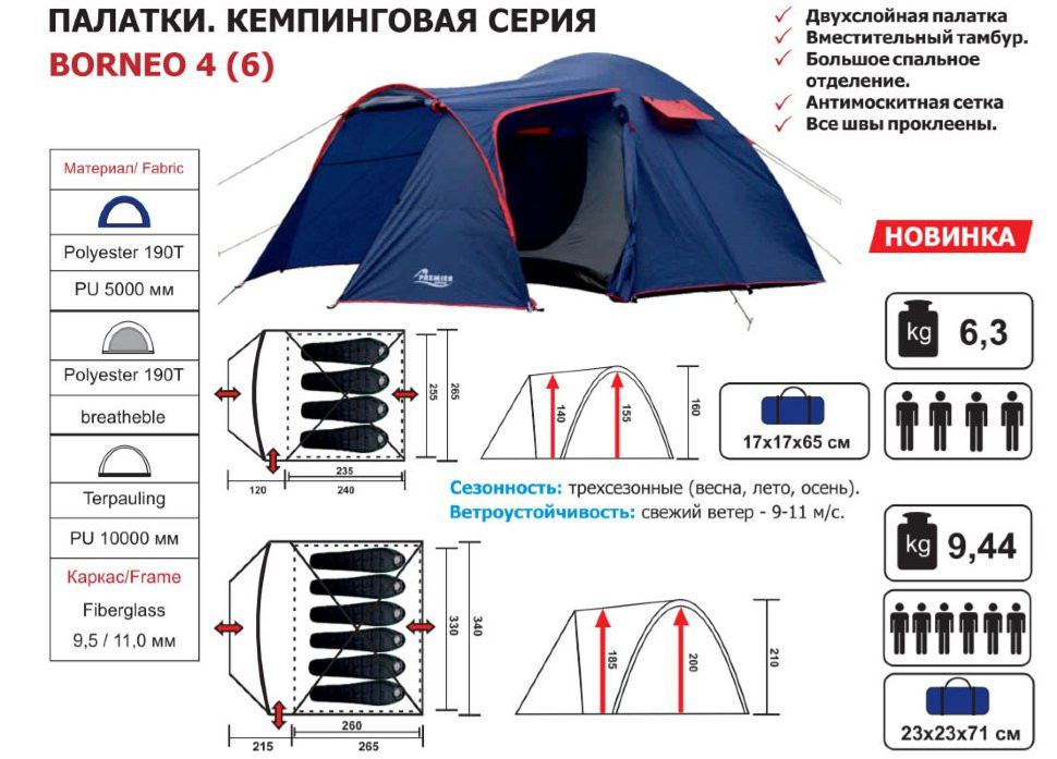 Количество мест 4 чел. Назначение кемпинговая Количество входов 2 Количество комнат 1 Количество тамбуров 1 Тип каркаса внутренний Внутренняя палатка Да Геометрия полусфера Водостойкость тента, (мм в. ст.) 2000 мм водн. cт. Противомоскитная сетка Да Проклеенные швы Да Размер внешней палатки (ДхШхВ) 360x265x160 см Размер внутренней палатки (ДхШхВ) 240x240x155 см Вес 5.6 кг