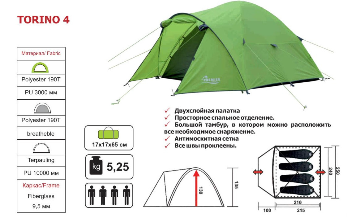 Палатка TORINO-4 PREMIER – четырехместная палатка универсальной серии, которая идеально подойдет для пеших походов и велосипедных путешествий.
