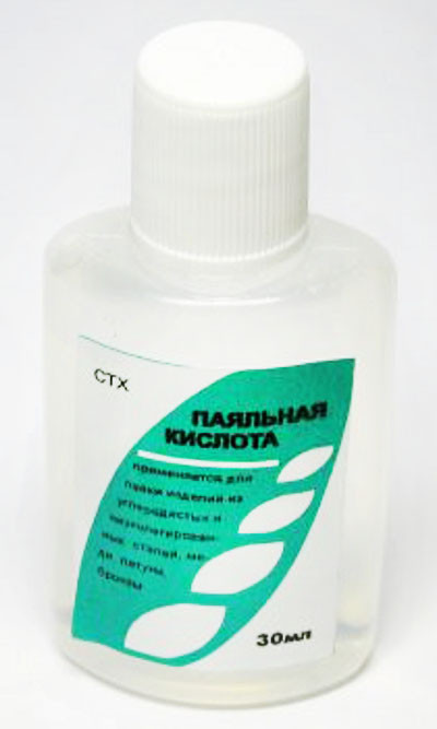 Паяльная кислота - для пайки углеродистых и низколегированных сталей, деталей и узлов из черных и цветных металлов. меди, никеля и их сплавов. Состав: хлористый цинк (40%), вода (60%). Рекомендована отмывка 5% раствором кальцинированной соды.