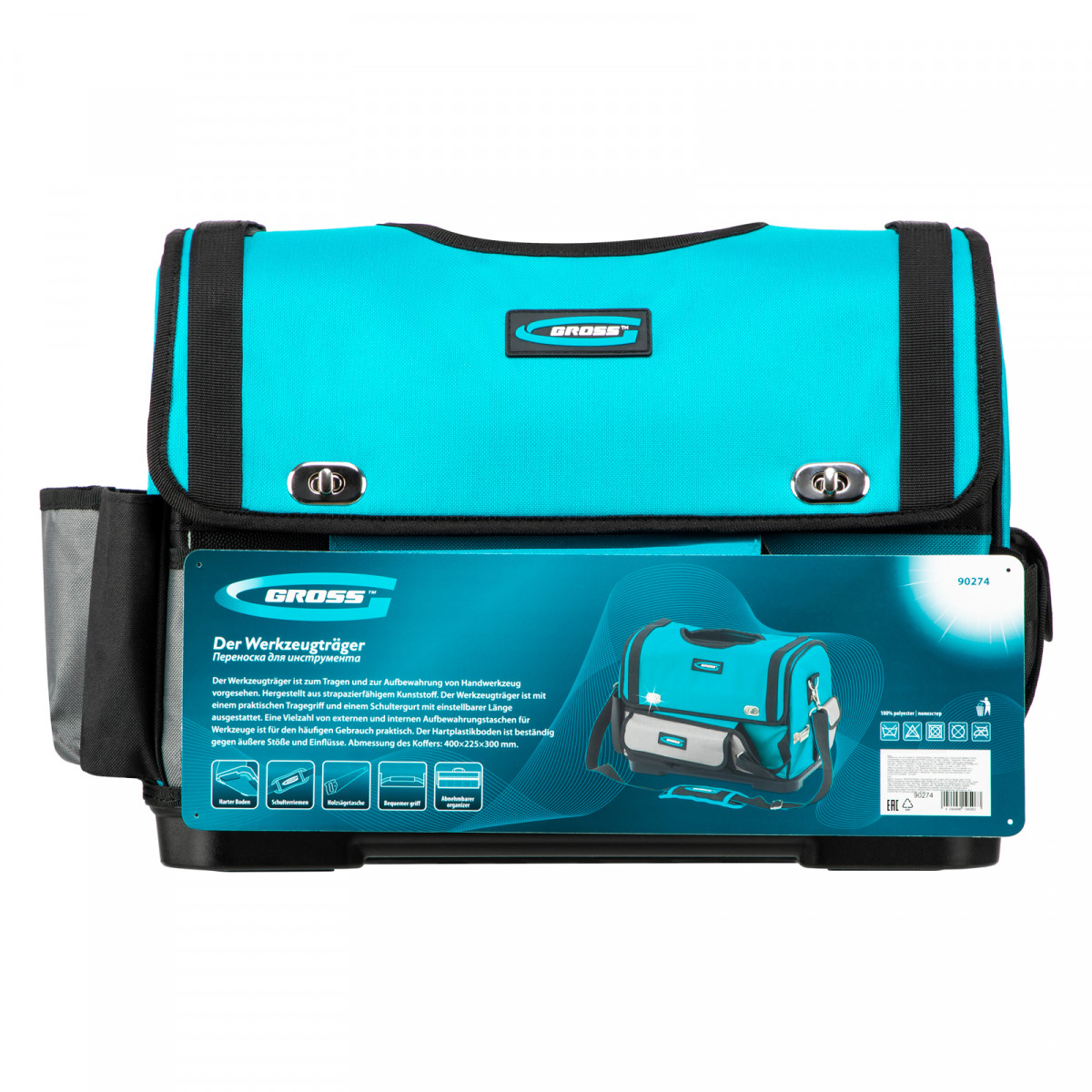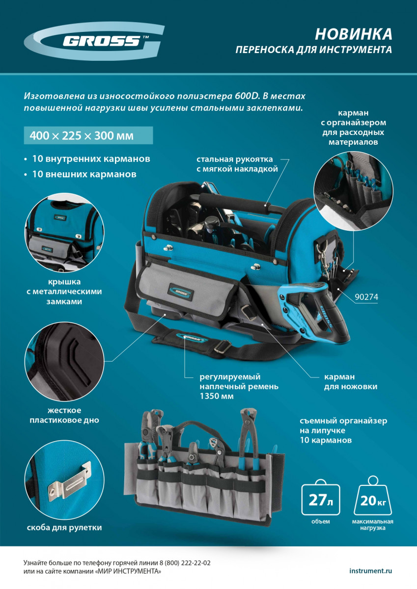 Переноска Gross 90274 размером 400 х 225 х 300 мм с пластиковым дном и наплечным ремнем используется для хранения и перемещения ручного и электроинструмента. Сумка с прочным дном и надежной ручкой выдерживает значительный вес. Пригодится дома, в гараже и поездке.