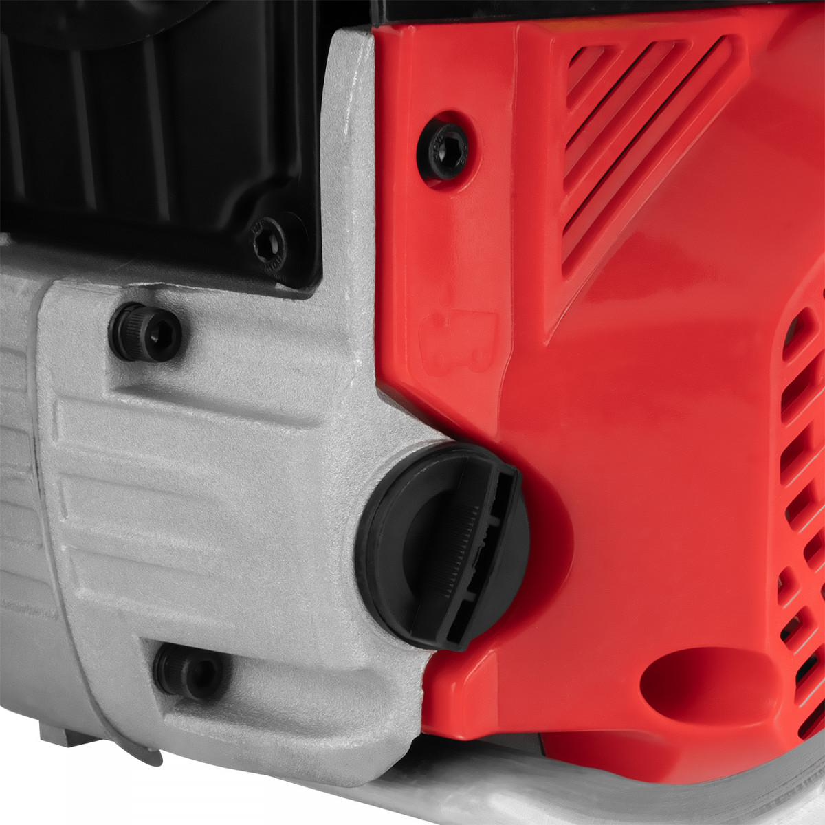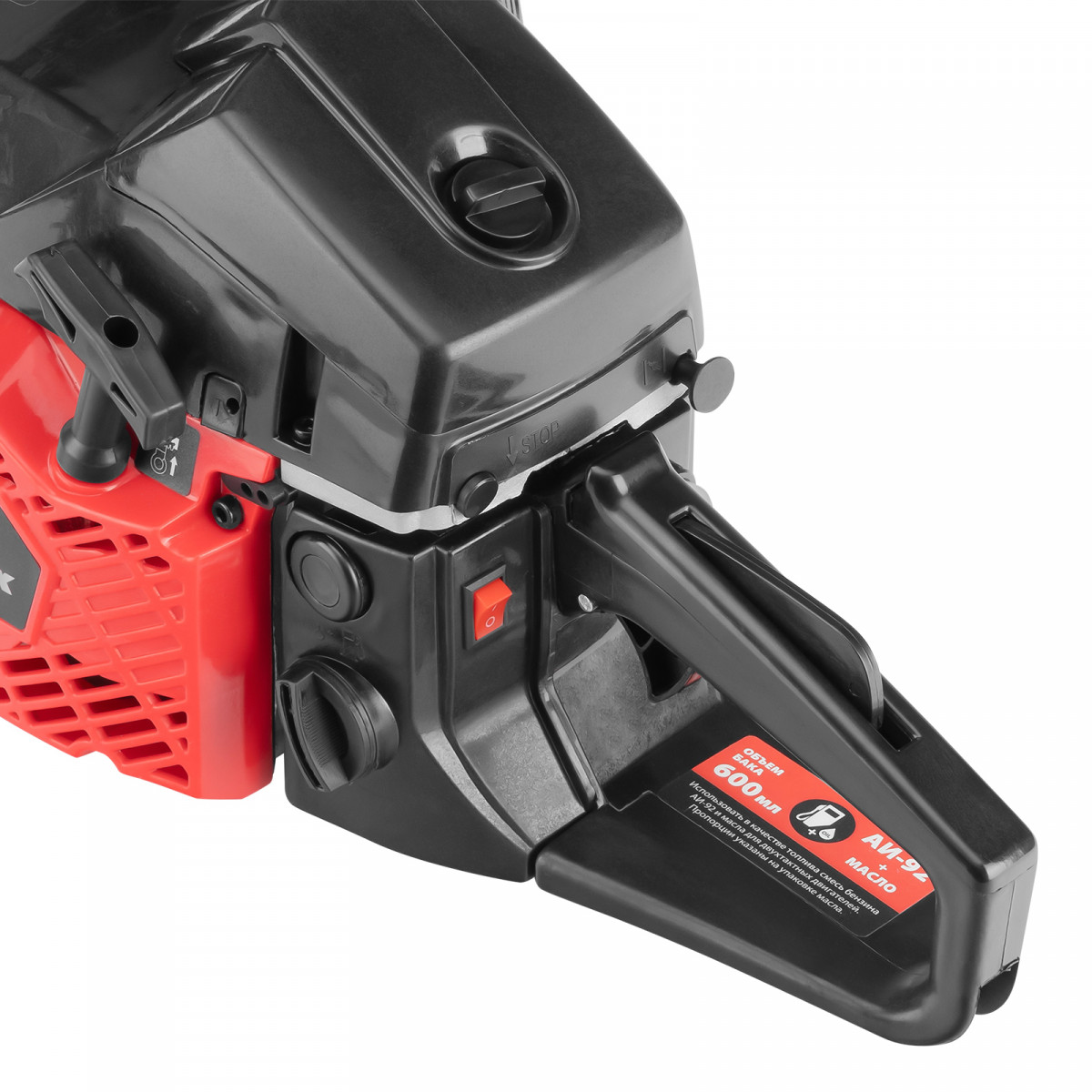 - Безопасная эксплуатация — функция блокировки газа предотвращает случайный запуск, тормоз цепи снижает риск травмирования при отскоке пилы.