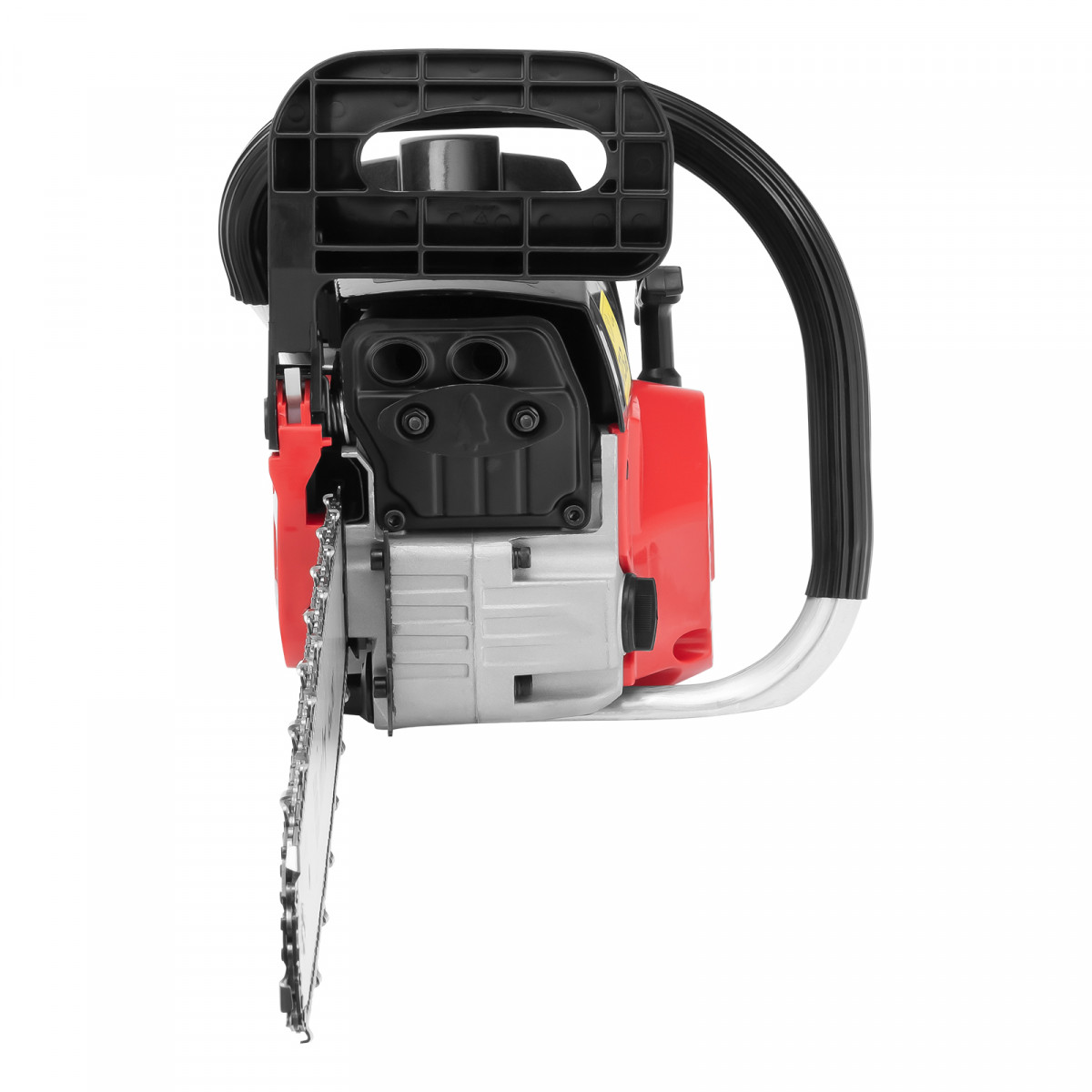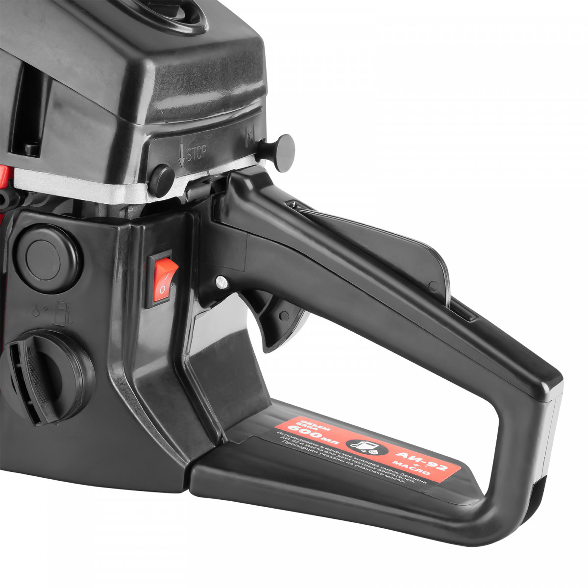 - Безопасная эксплуатация — функция блокировки газа предотвращает случайный запуск, тормоз цепи снижает риск травмирования при отскоке пилы.