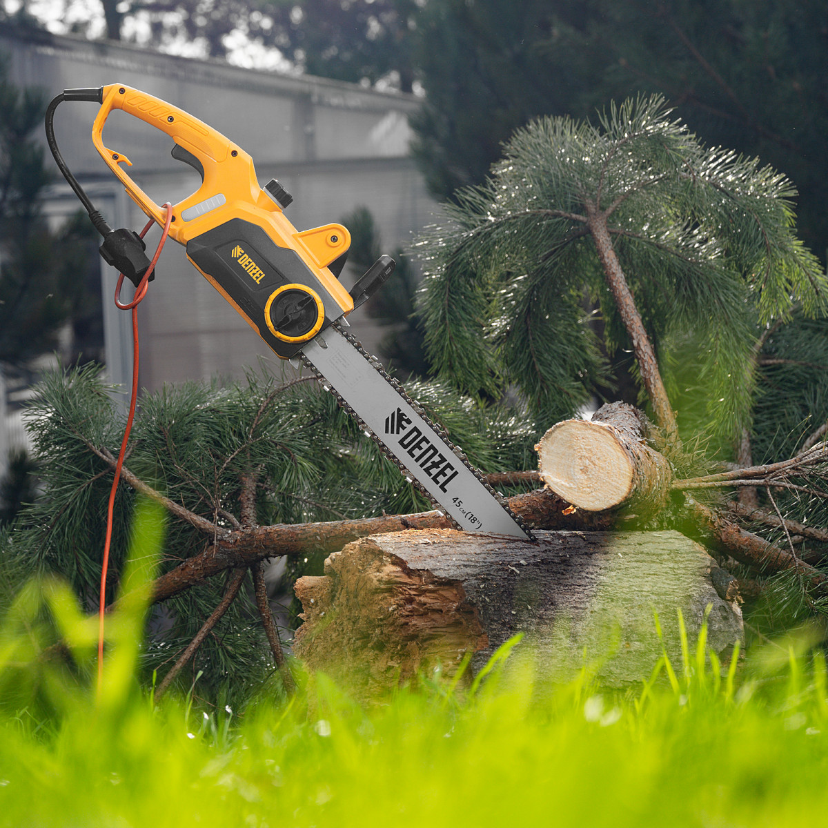 Пила цепная электрическая EDS-2200P, 2.2 кВт,поперечная, шина 45 см, шаг 3/8, паз 1.3 мм, 63 звена Denzel