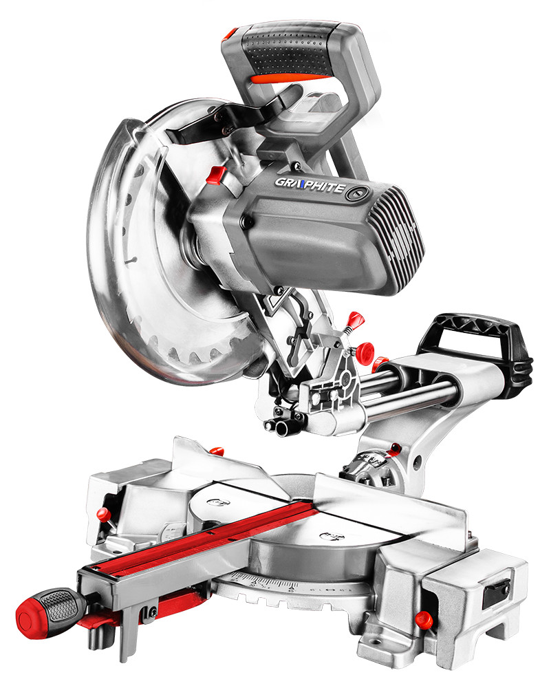Пила торцовочная GRAPHITE с движущейся головкой, с двигателем мощностью 1800 Вт, предназначена для точной резки крупных деталей из древесины и ее производных. Инструмент оснащен возможностью регулировки кронштейнов, поддерживающих обрабатываемый материал, а также возможностью быстрой настройки чаще всего используемых углов распила. Диапазон распила под прямым углом и под заданным косым углом составляет от 0° до 45°. Пила имеет плотную устойчивую конструкцию, изготовленную из алюминиевого сплава, оснащена металлическим блокиратором шпинделя. Для комфорта и в целях безопасности основная рукоятка инструмента покрыта антискользящим материалом. Точную установку обрабатываемого материала облегчает лазерный указатель, встроенный в инструмент. Можно самостоятельно заменять угольные щетки. В набор вместе с пилой входят: пылесборник, вертикальный зажим для крепления обрабатываемого материала и монтажный ключ. Соответствие европейским стандартам обеспечивает сертификат СЕ.