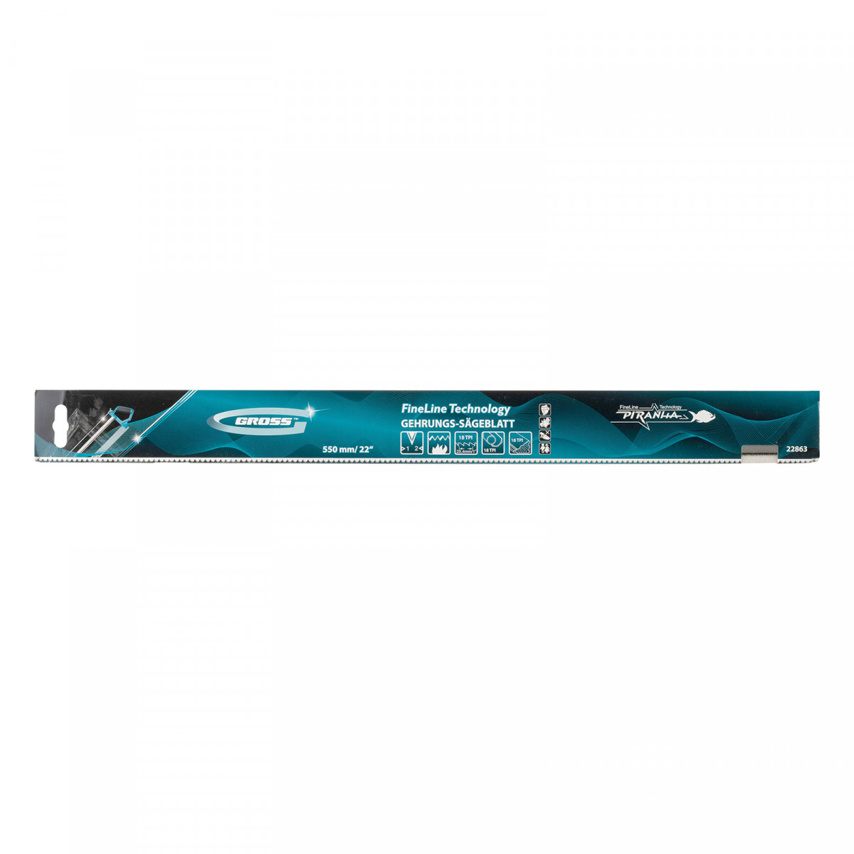 Пильное полотно Gross «PIRANHA» 22863 длиной 550 мм, с каленым зубом с 2D-заточкой, 18 TPI — режущий элемент для прецизионного стусла, применяемый для распила под углом заготовок из дерева, мягкого металла и пластика. Мелкие зубья с шагом 18 TPI позволяют получить точный и чистый рез. Полотно используется для пиления плинтусов, реек, дверных наличников и других деталей.