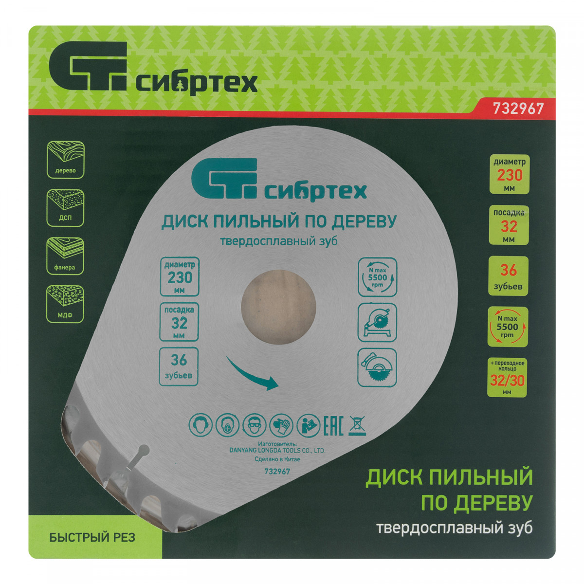 Пильный диск по дереву Сибртех 732967 диаметром 230 х 32 мм, с 36 зубьями и переходным кольцом 32/30, предназначен для быстрого распила древесины мягких и твердых пород, фанеры, ДСП, МДФ. Используется с циркулярными и торцовочными пилами с посадочным диаметром 32 мм. Переходное кольцо 32/30 позволяет при необходимости изменить размер посадки. Крупные зубья обеспечивают быстрый рез. Диск подходит для бытового применения.
