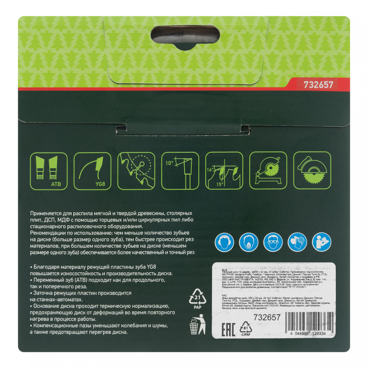 Пильный диск Сибртех 732657 диаметром 250 х 32 мм, с 24 зубьями, используется с торцовочными и циркулярными пилами, а также с распиловочными станками. Предназначен для продольного и поперечного пиления древесины мягких и твердых пород, фанеры, МДФ и ДСП. Благодаря крупным зубьям достигается высокая скорость реза. Диск применяется для выполнения строительных, ремонтных работ, а также для решения бытовых задач.
