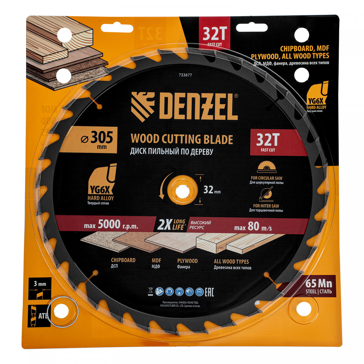 Пильный диск Denzel 733677 диаметром 305 x 32 мм, с 32 зубьями, предназначен для быстрого продольного и поперечного распила твердой и мягкой древесины, фанеры, МДФ, ДСП. 32 зуба типа ATB с режущими пластинами оптимальной геометрии обеспечивают качественный рез. Режущие пластины из твердого сплава YG6X сохраняют рабочие свойства при интенсивном использовании. Диск устанавливается на циркулярную, торцовочную пилу или на распиловочный станок. В комплект поставки входит переходное кольцо с 32 на 30 мм, что позволяет изменить посадочный размер и расширяет возможности использования диска.