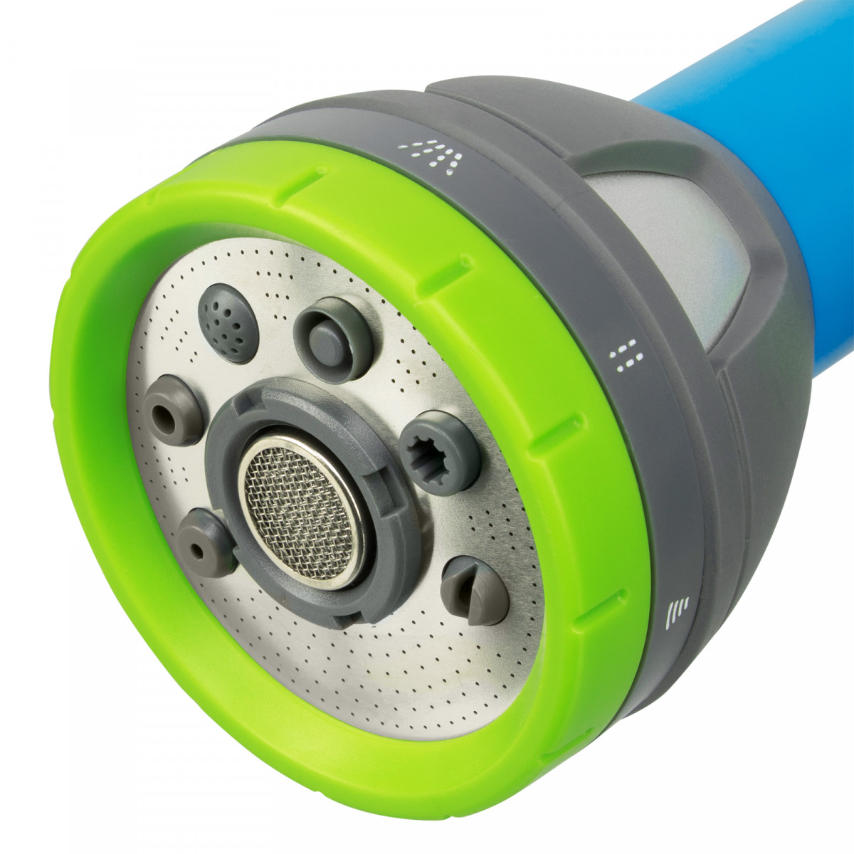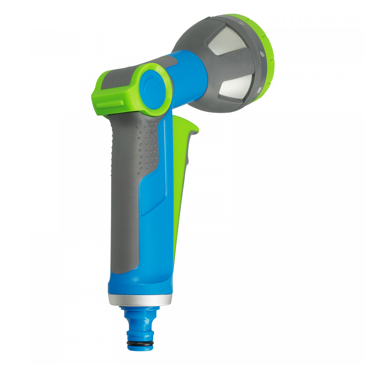 - 8 типов распыления — конусное, вертикальное и горизонтальное, душ, жесткая струя, веер, туман, полный полив.