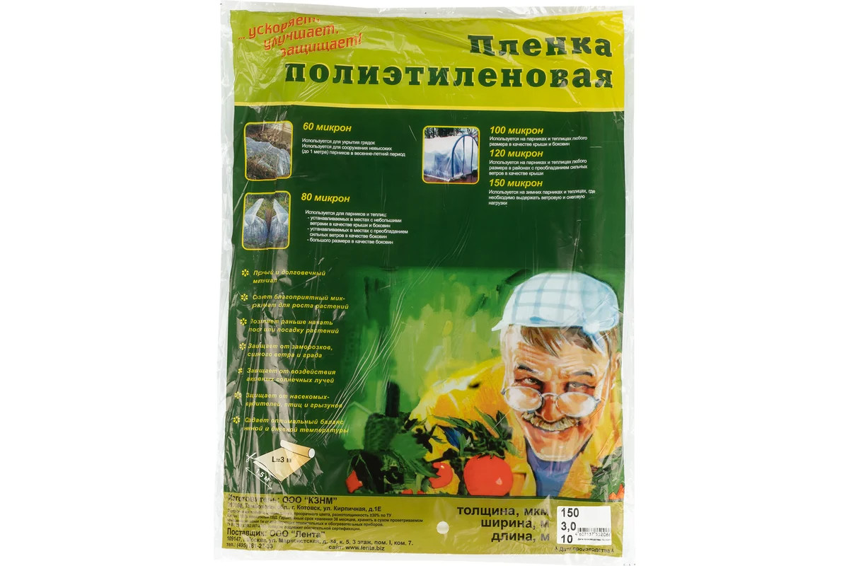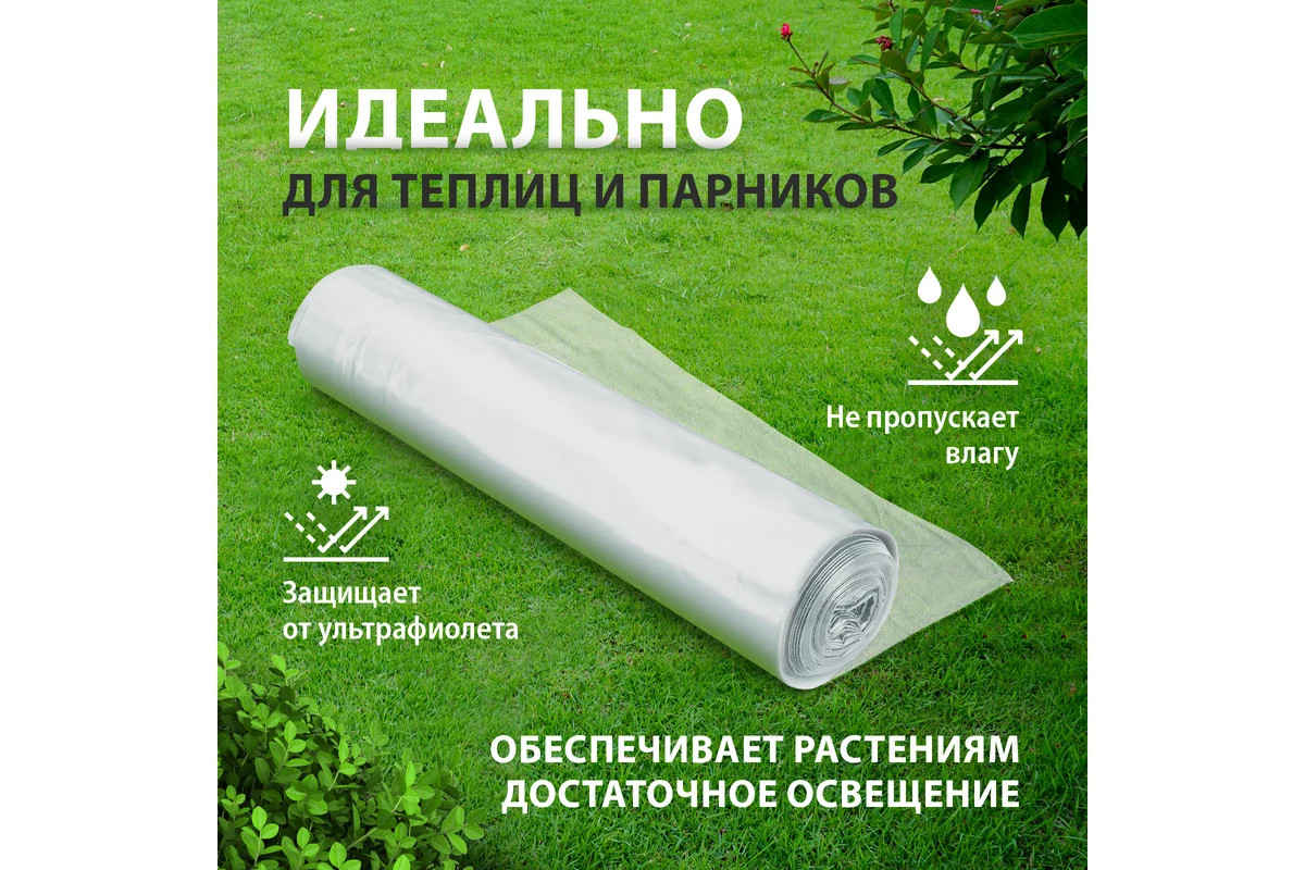 Фасованная полиэтиленовая пленка используется для обшивки каркасов парников и теплиц, укрывания силосных ям и выращивания рассады. Плотная пленка успешно противостоит ветру и осадкам, не пропускает влагу и ультрафиолет, но обеспечивает растениям достаточное освещение. Материал также будет полезен в строительстве для защиты стройматериалов и конструкций, покрытых сохнущими растворами, а также для укрывания поверхностей и предметов обстановки во время проведения ремонтных работ. Преимущества: - Высокая прочность и эластичность — пленка изготовлена из первичного полиэтилена и не содержит посторонних примесей. - Сохранение тепла — пленка поддерживает температуру в парнике или теплице приблизительно на 5 градусов выше, чем снаружи, поэтому растения надежно защищены от возвратных заморозков и холодных рос.