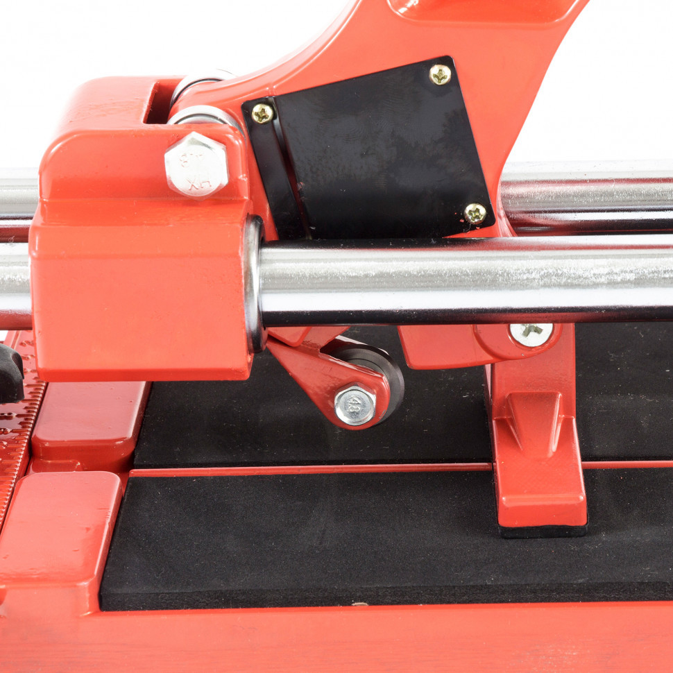 - Устойчивое основание и неподвижность плитки — плиткорез снабжен цельнолитой станиной из алюминиево-магниевого сплава с обрезиненной поверхностью, а также мягкими амортизирующими накладками.