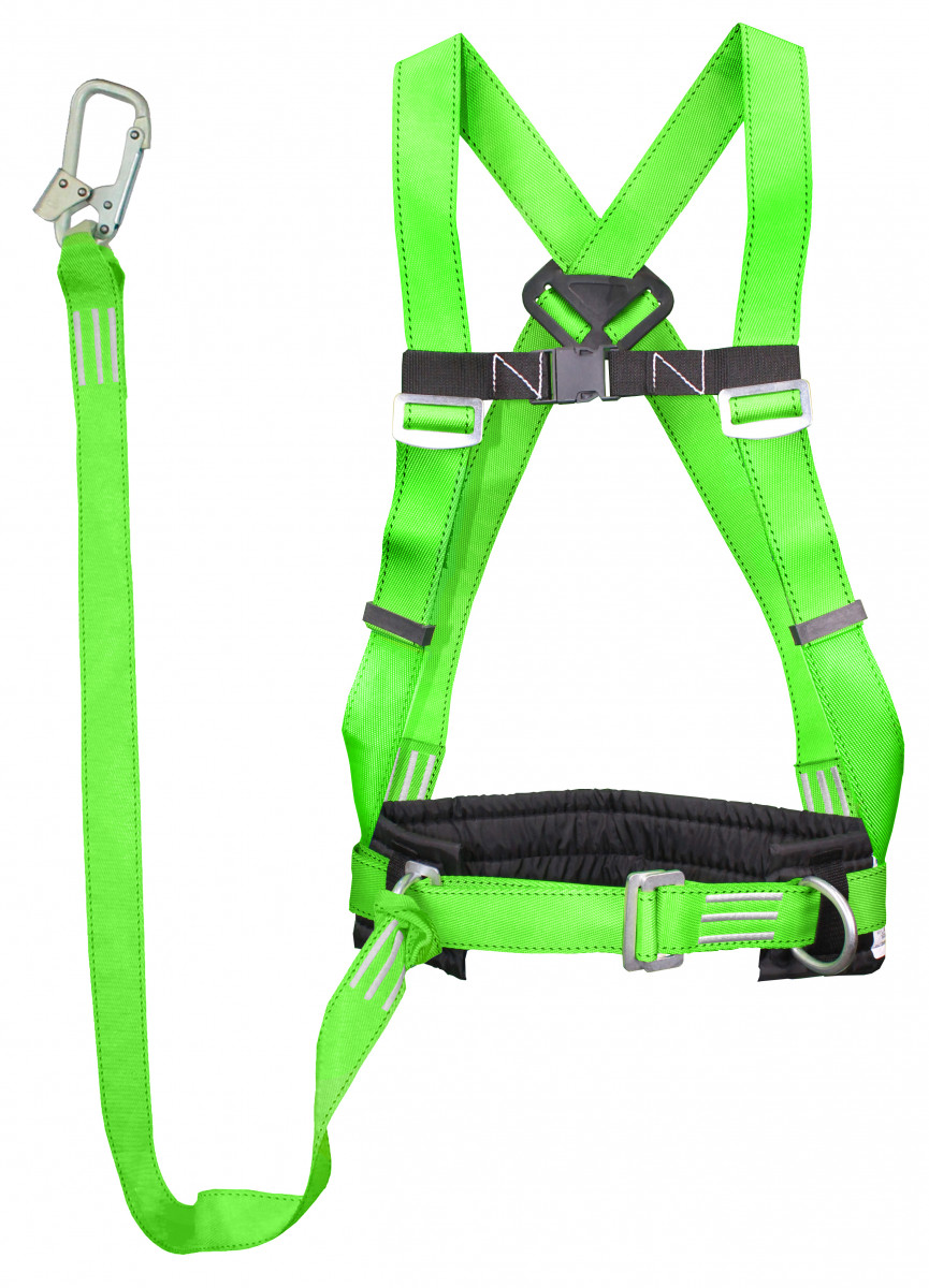 Включает в себя ремень с пряжкой (позволяет подгонять пояс по фигуре человека), подкладку под ремень (кушак), наплечные лямки, элементы крепления – два металлические D-кольца на ремне привязи и одно на спине, строп из полиамидной ленты с монтажным карабином (4 типа карабинов), бирку, выполненную в соответствии с ГОСТ Р ЕН 365, паспорт-инструкцию с отметкой ОТК и гарантией производителя (закреплен под биркой на кушаке).