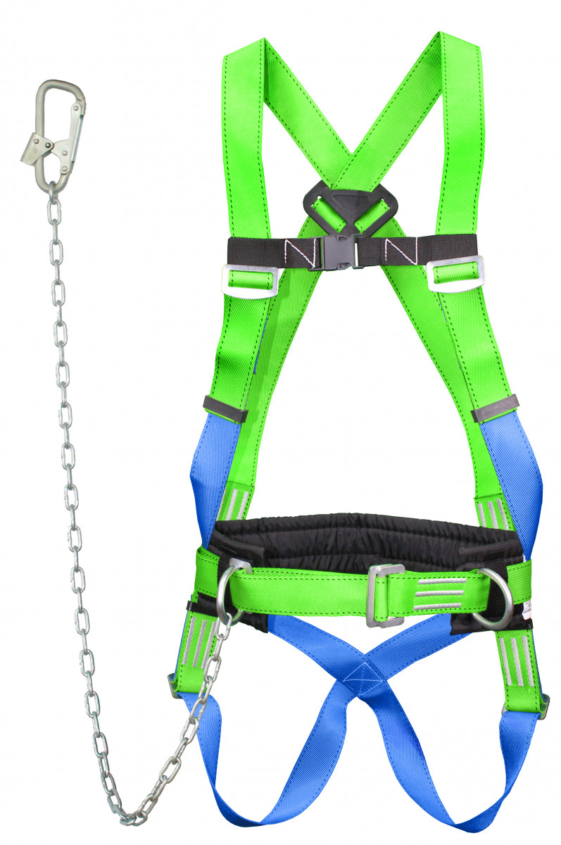 Включает в себя ремень с пряжкой (позволяет подгонять пояс по фигуре человека), подкладку под ремень (кушак), наплечные и набедренными лямки, элементы крепления – два металлические D-кольца на ремне привязи и одно на спине, строп из металлической цепи с монтажным карабином (4 типа карабинов), бирку, выполненную в соответствии с ГОСТ Р ЕН 365, паспорт-инструкцию с отметкой ОТК и гарантией производителя (закреплен под биркой на кушаке).