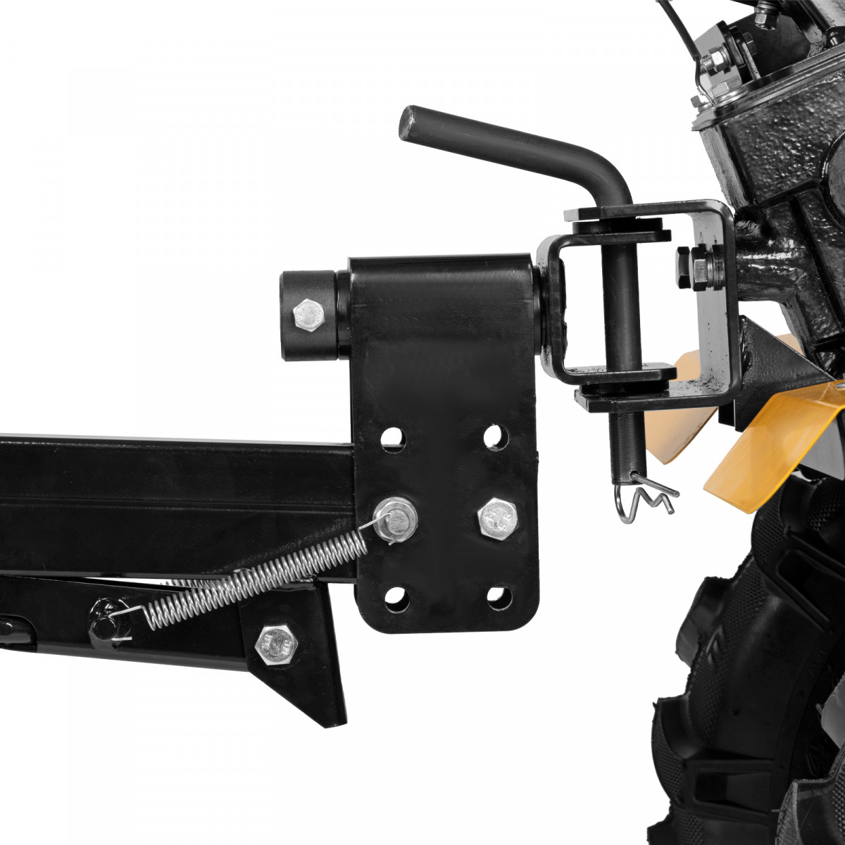 • Продуманная конструкция — пружинная подножка сцепки обеспечивает устойчивость прицепа, не соединенного с мотоблоком.