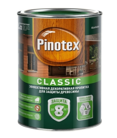 Пропитка cодержит активные добавки против плесени и синевы. Окрашенная поверхность устойчива к воздействию солнца, дождя, снега и мороза. Pinotex Classic легко наносится и быстро впитывается в поверхность древесины, образуя полуматовое покрытие. Подчеркивает естественную текстуру древесины. Для усиленной защиты глубоких слоев древесины от биокоррозии рекомендуется применять пропитку в системе с грунтовкой Pinotex Base. Возможно применение для защиты бревенчатых строений и полукруглых облицовочных профилей.
