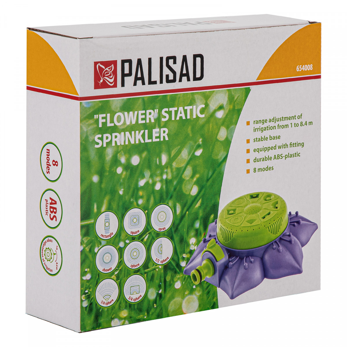 Распылитель-дождеватель Palisad на подставке, с регулировкой и 8 режимами, позволяет создать оптимальные условия содержания растений, обеспечить регулярный и равномерный полив. Он подходит для участков среднего размера площадью до 66 кв. м. Благодаря наличию 8 режимов можно организовать орошение секторов различной формы.