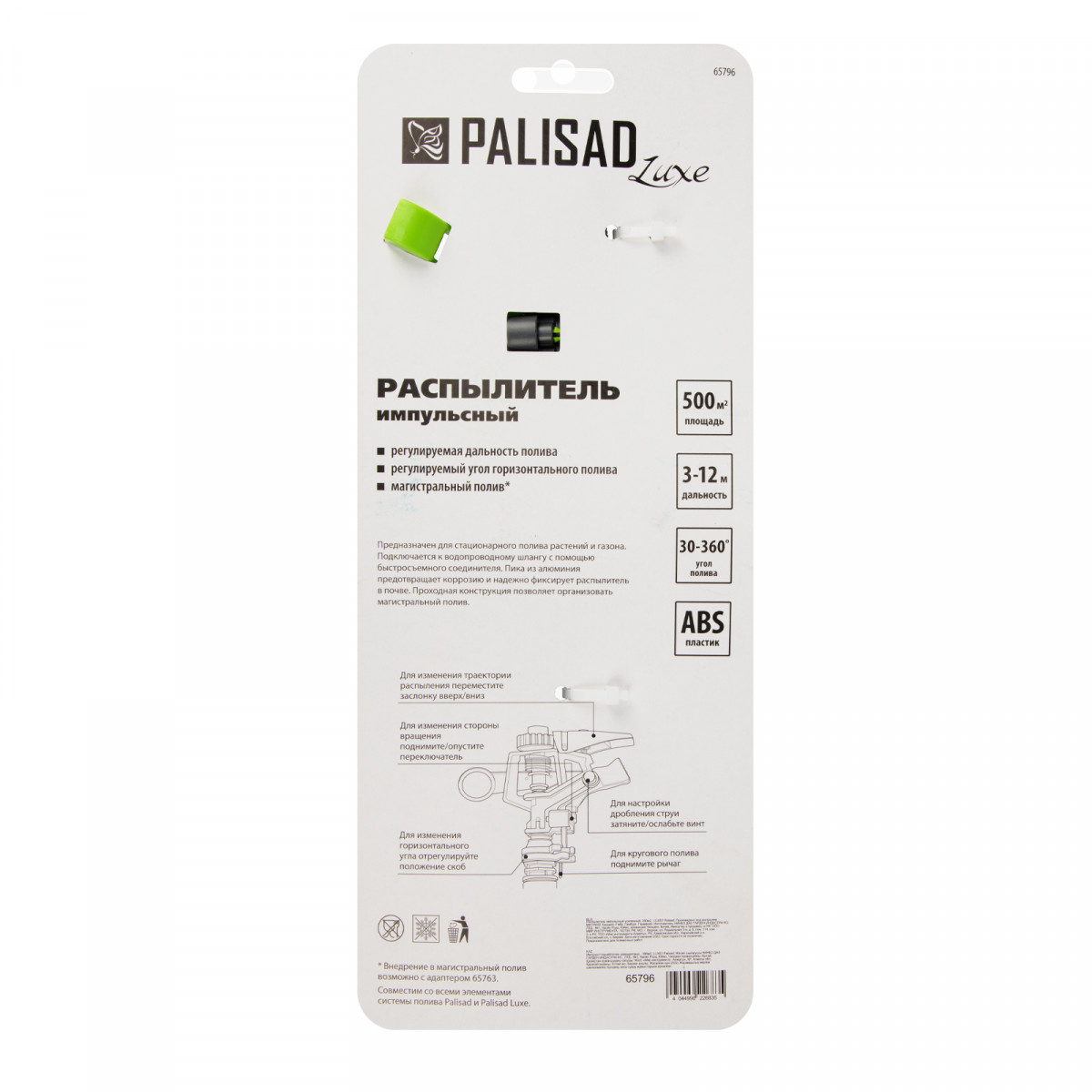 Импульсный усиленный разбрызгиватель Palisad Luxe 65796 с регулировкой угла горизонтального распыления до 33 м позволяет организовать стационарный полив на участке площадью до 390 кв. м. Меняя угол струи и дальность разбрызгивания, можно задавать конкретный сектор орошения. Устройство пригодится для ухода за зелеными насаждениями на приусадебном участке и прочих озелененных территориях.