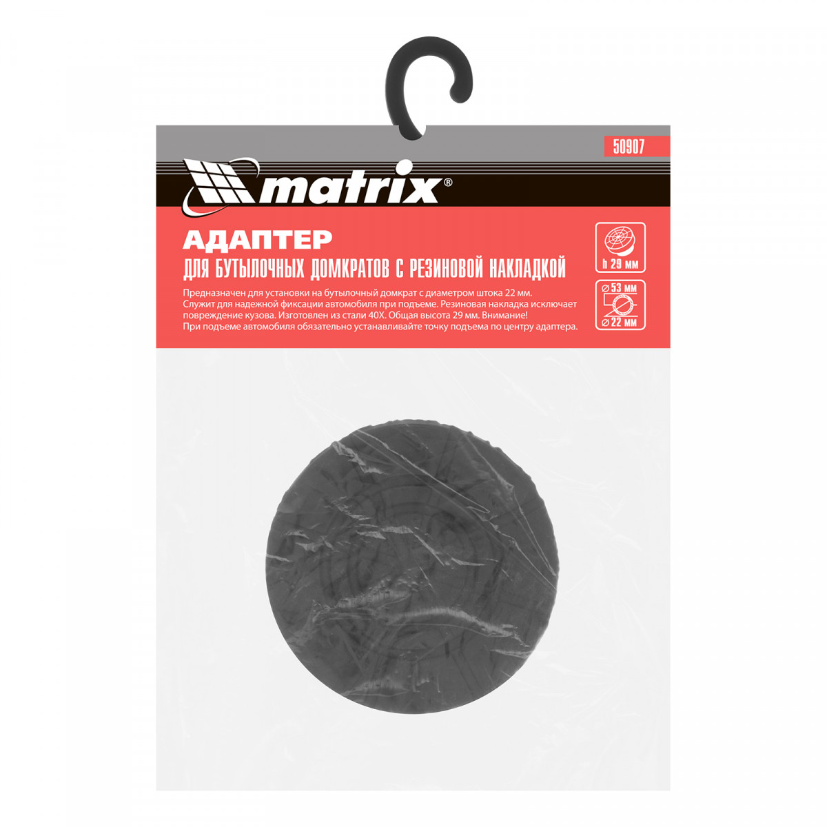 Адаптер для бутылочных домкратов Matrix 50907 с резиновой накладкой устанавливается на шток диаметром 22 мм и защищает кузов автомобиля во время его подъема. Уверенно выдерживает нагрузку в 2 тонны. Опора совместима с домкратами Sparta 50321, 50322, 50332, 50331, 50341, Matrix 50715, 50750, Stels 51160.