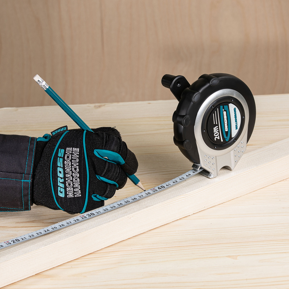Геодезическая рулетка Gross Rollmassband 31251 в закрытом корпусе, с металлической лентой 20 м х 13 мм с нейлоновым покрытием, используется для определения расстояний и размеров различных объектов. Механизм заключен в двухкомпонентный закрытый корпус из пластика и термостойкой резины, поэтому рулетка устойчива к повреждениям в результате случайных ударов и падений. Комбинированный зацеп упрощает фиксацию измерительной ленты на измеряемой поверхности. Инструмент будет полезен на строительной площадке или земельном участке, а также при проведении обмеров внутри помещений.