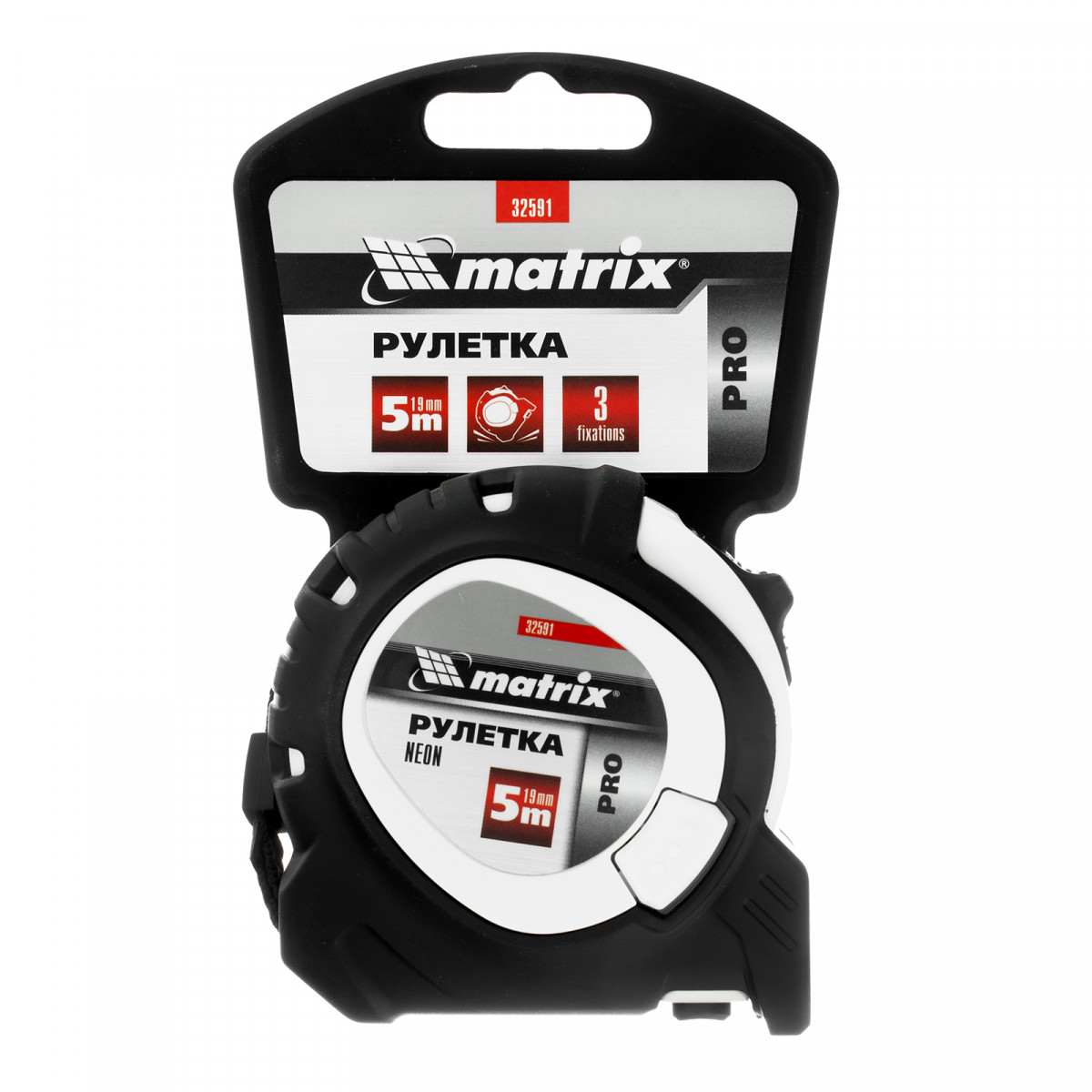 Рулетка Neon,5 м x 19 мм,обрезиненный корпус,3 фиксации,Pro Matrix