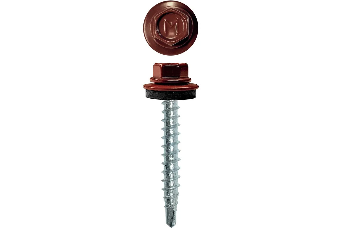 Используется при монтаже профнастила и металлочерепицы к конструкциям из металла или древесины. Имеет шестигранную головку с шайбой и прокладку EPDM из синтетического каучука.