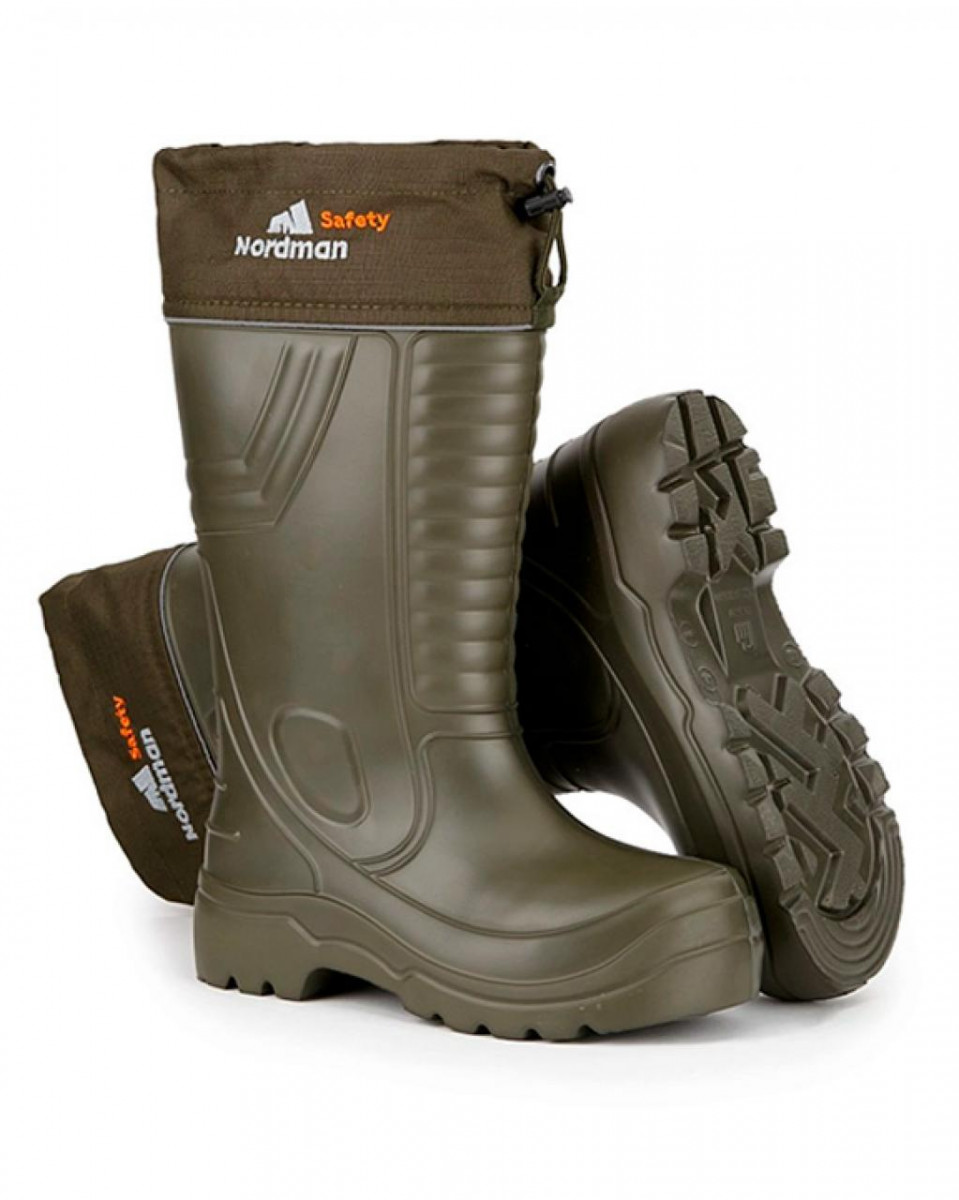 Зимние сапоги из ЭВА серии специализированной обуви с защитными элементами «Nordman Safety», модель с композитным подноском и металлостелькой Композитный подносок защищает носочную часть стопы от механических воздействий до 200 Дж, а дублированная стелька из кожкартона - от незначительных проколов. Съемный многослойный вкладыш (мех шерстяной, нетканое полотно, фольга, полиэфирная сетка).